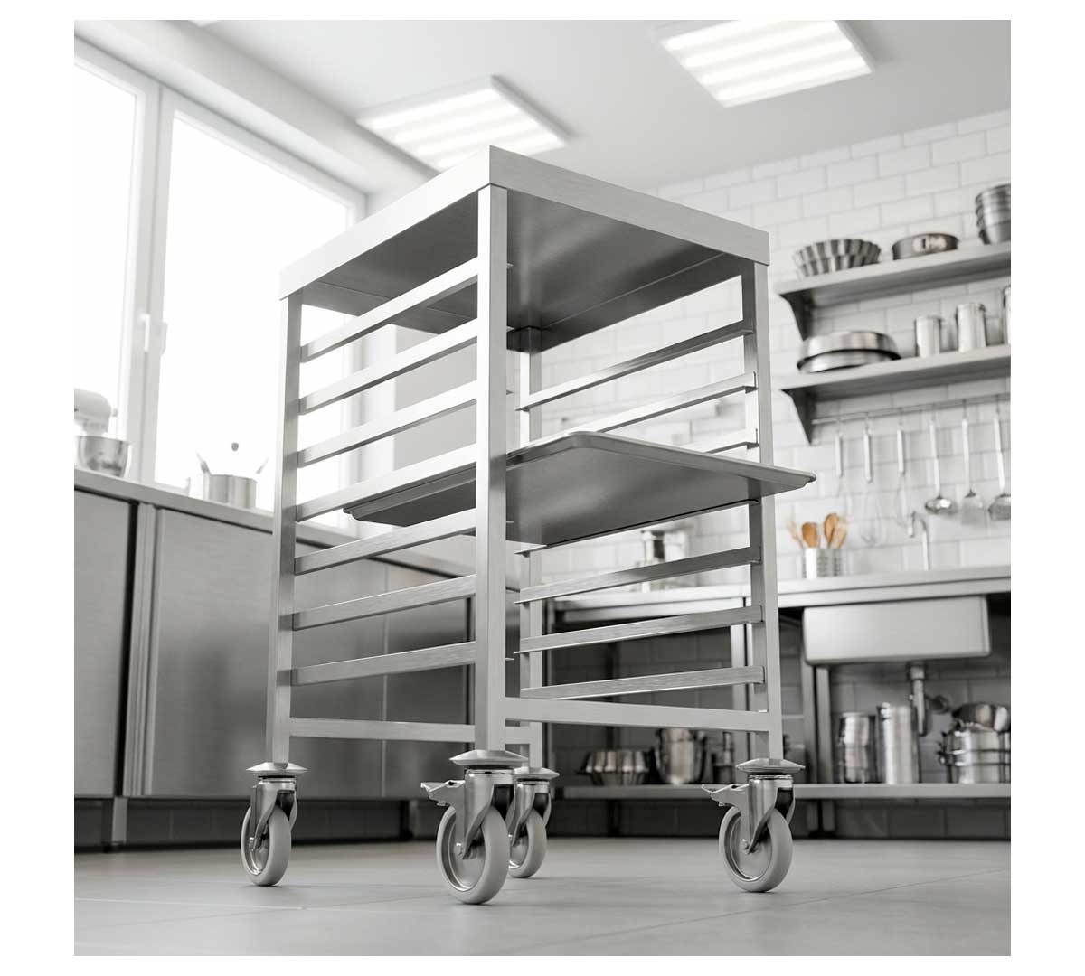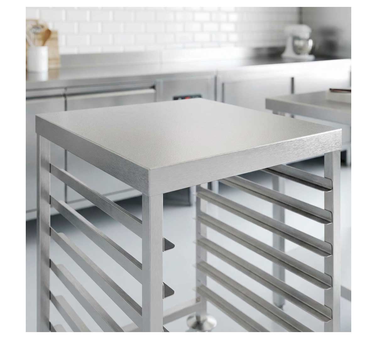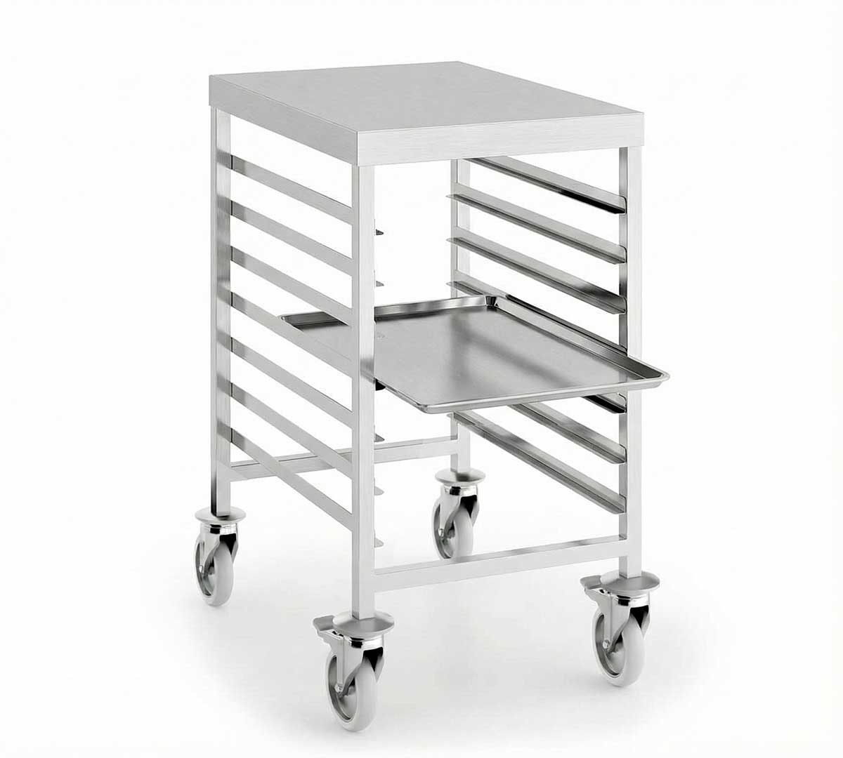 Carro bajo porta bandejas fabricado en acero inoxidable satinado. Con capacidad para 7 bandejas pasteleras con medidas 60 x 40 cm. Incluye encimera superior con tratamiento anti sonoro. Las bandejas no están incluidas. Está disponible montado o desmontado.