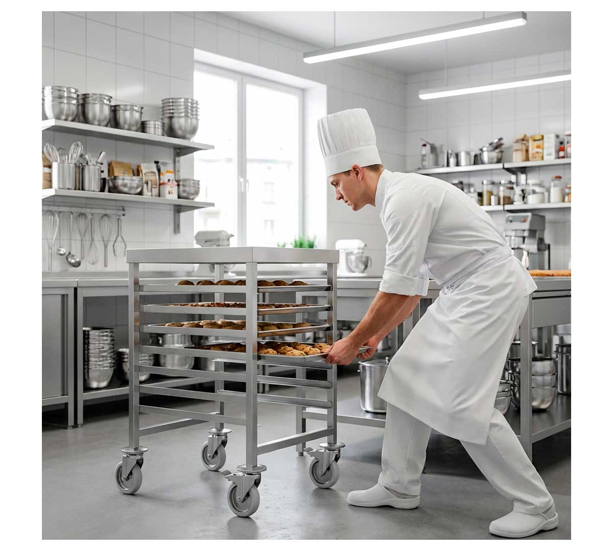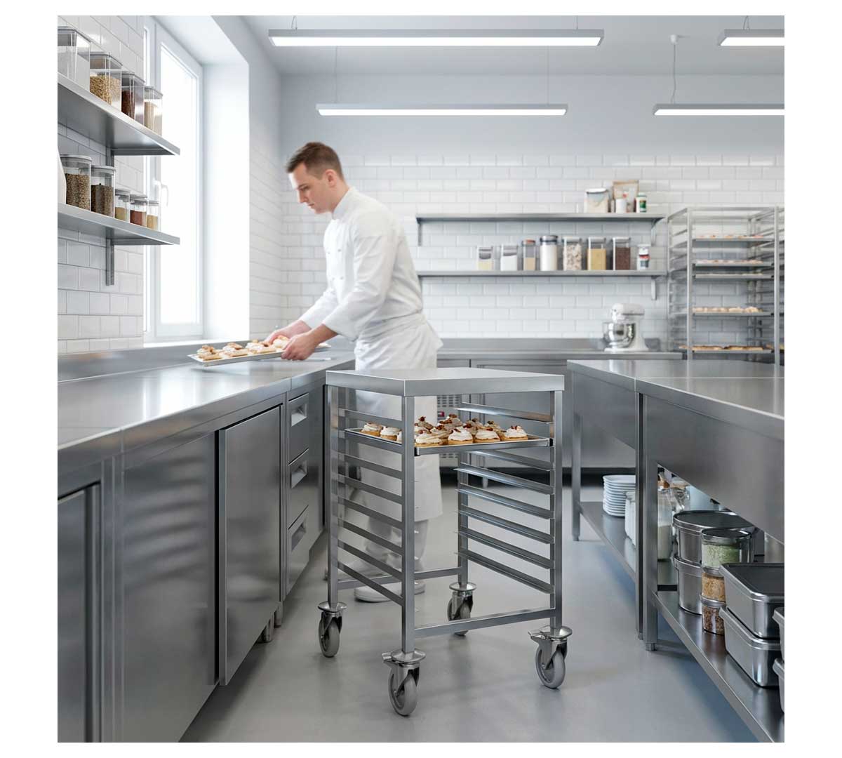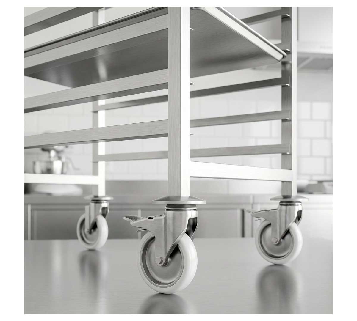 Carro bajo porta bandejas fabricado en acero inoxidable satinado. Con capacidad para 7 bandejas pasteleras con medidas 60 x 40 cm. Incluye encimera superior con tratamiento anti sonoro. Las bandejas no están incluidas. Está disponible montado o desmontado.