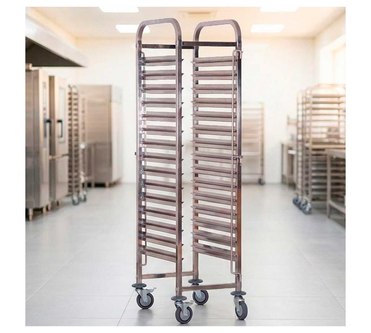 Carro bandejero para el transporte de bandejas de panadería y pastelería. Sirve para bandejas de 60 x 40 cm. Equipado con sistema de cierre en ambos lados para evitar caídas. Hay dos modelos disponibles.