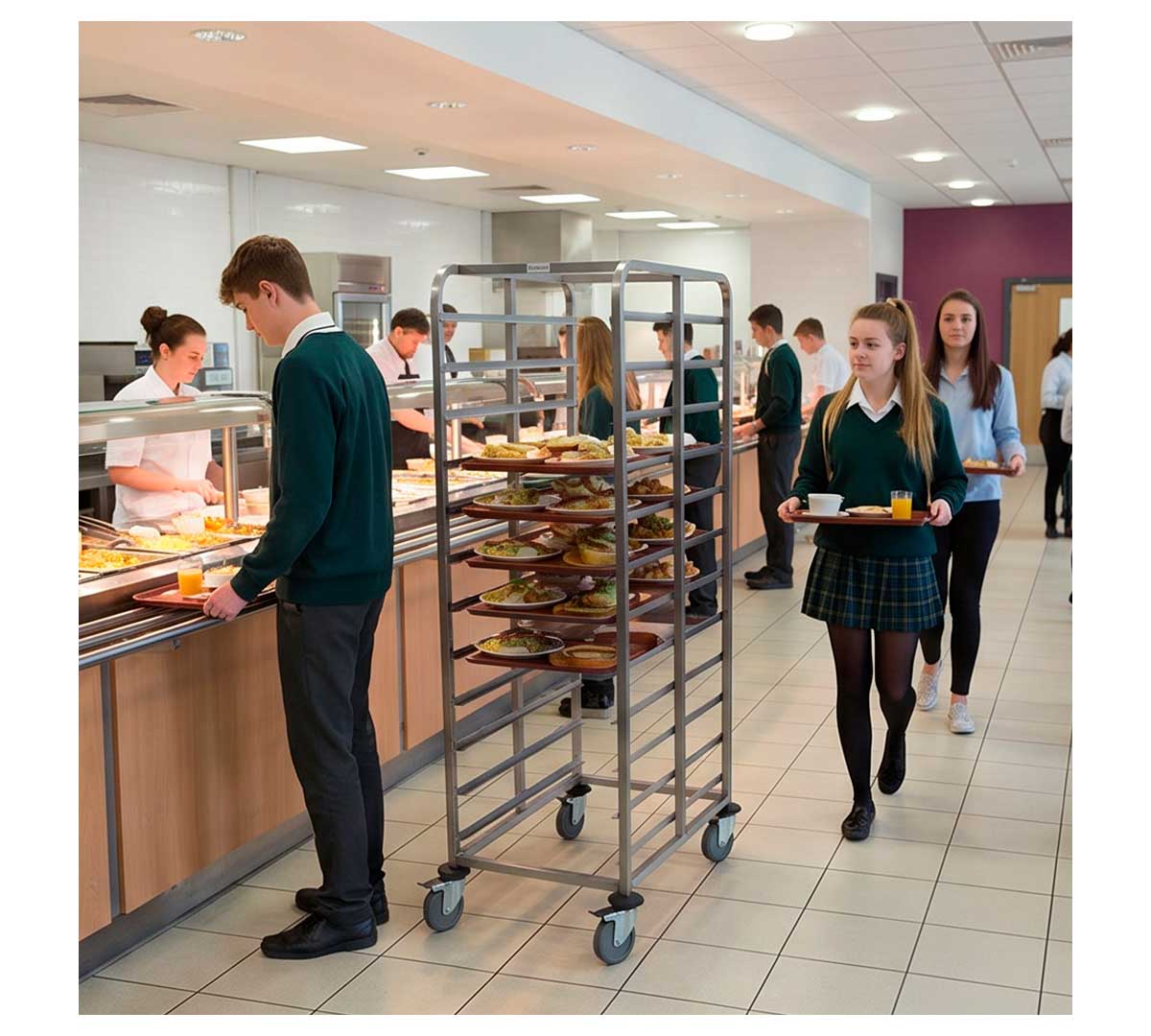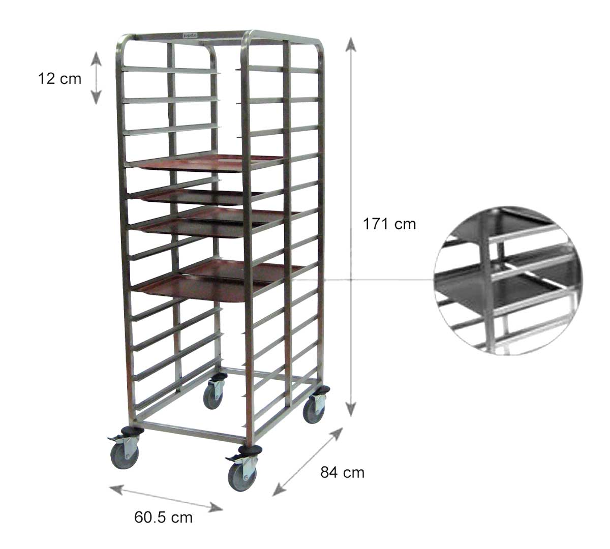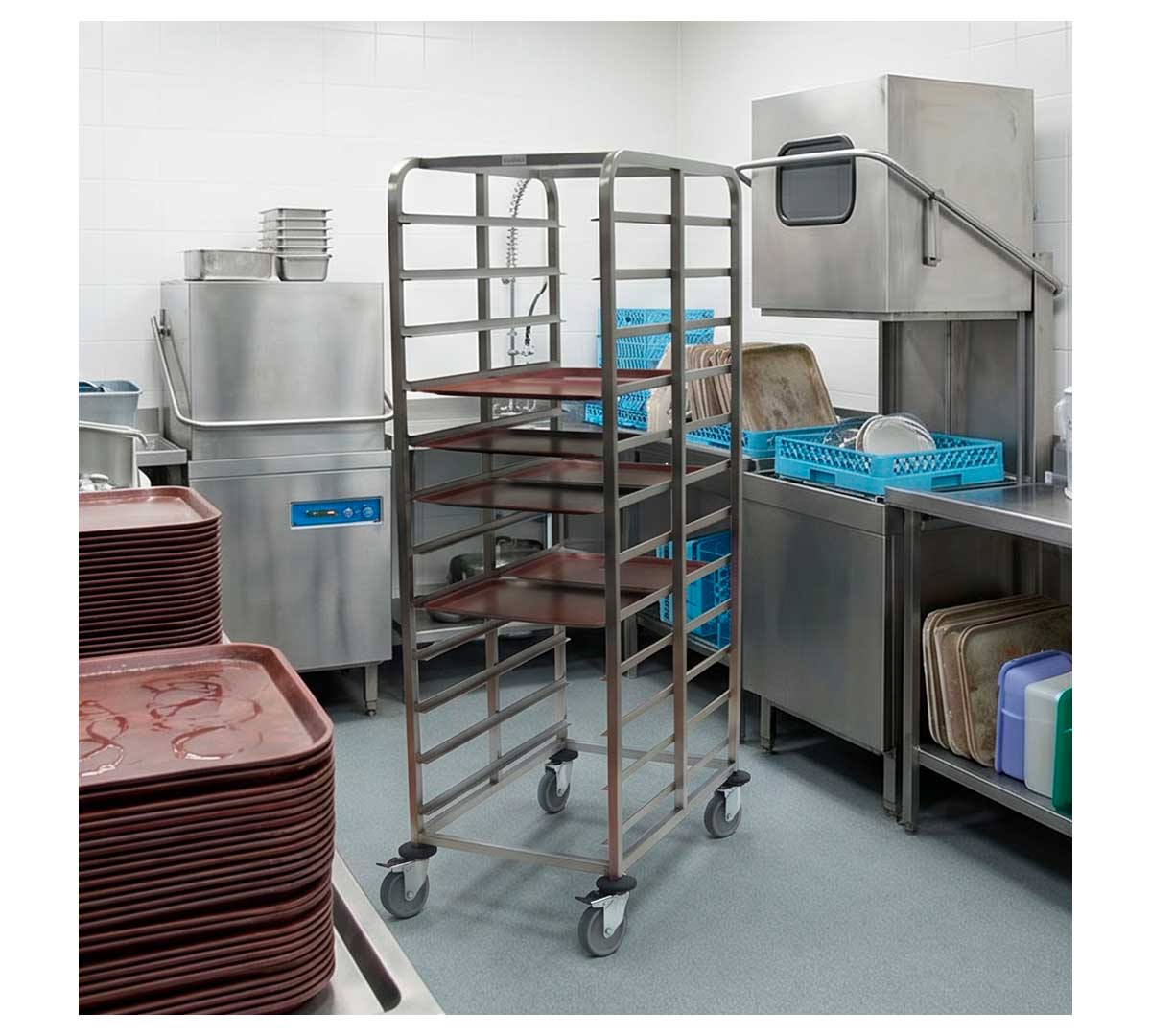 Este carro porta bandejas está disponible con ruedas poliamida con un coste extra. Consúltanos para más información.
