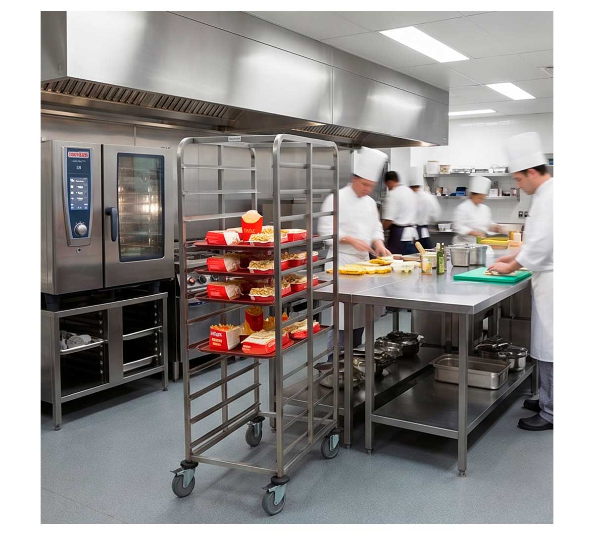 Carro doble porta bandejas fast food con capacidad para 24 bandejas con medidas 48 x 37 cm. Los niveles tiene una separación de 12 cm. Está equipado con 4 ruedas para facilitar su traslado. Las bandejas no están incluidas.
