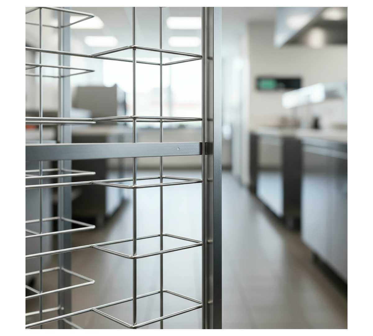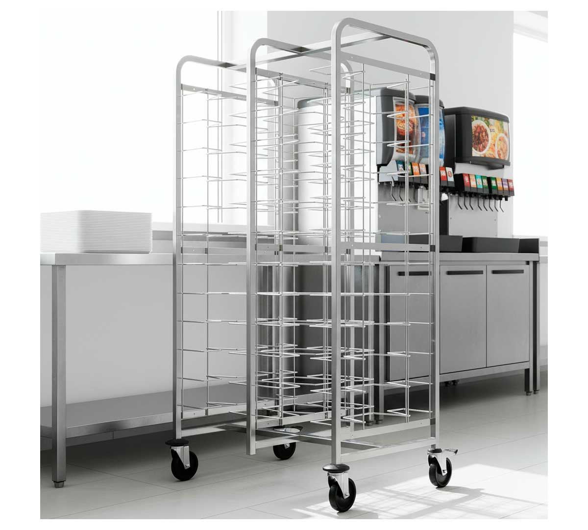 Carro doble porta bandejas para autoservicio. Está fabricado en acero inoxidable. Modelo abierto sin paneles laterales. Tiene capacidad para 24 bandejas con un ancho de 32,5 a 52,5 cm.