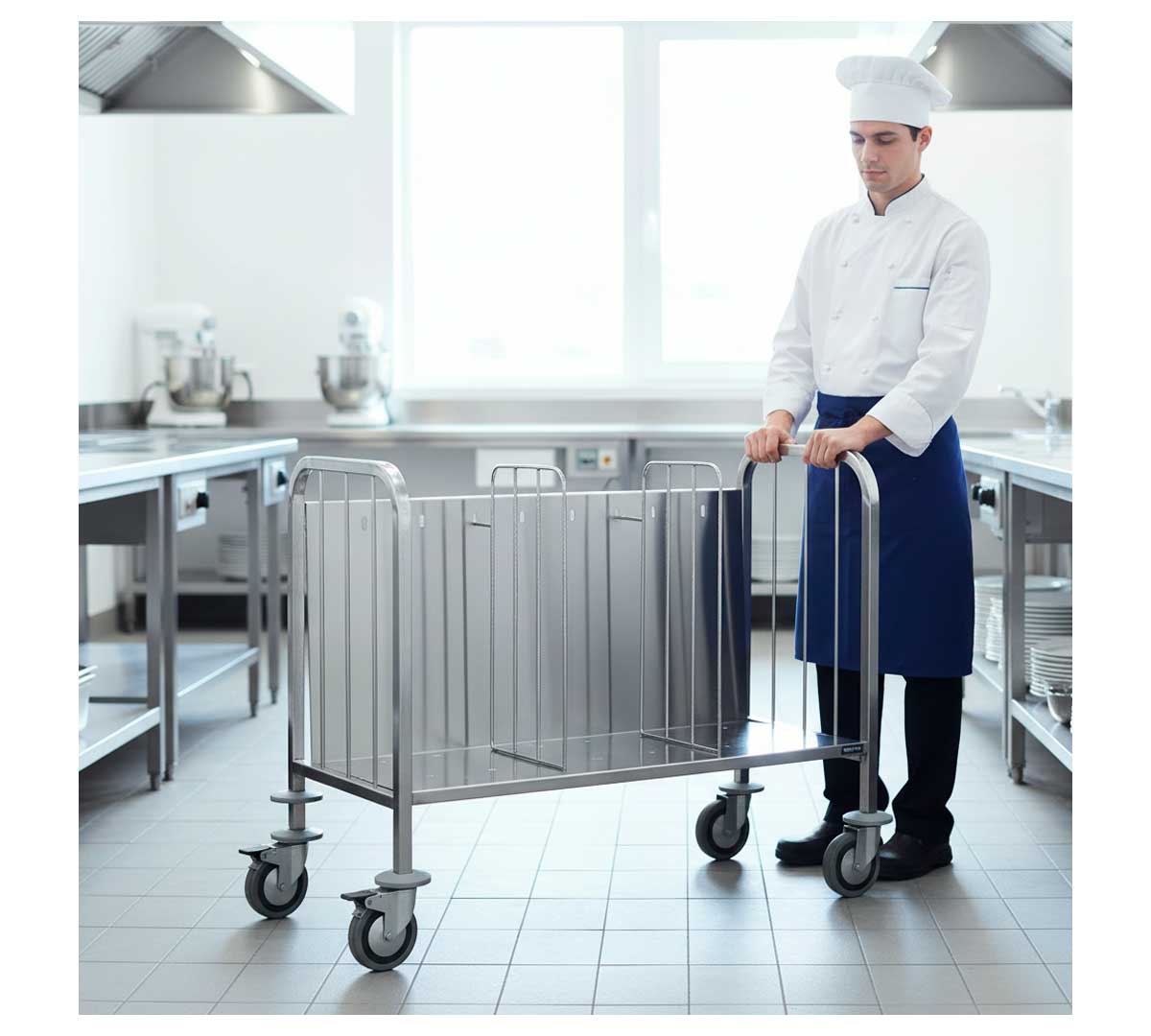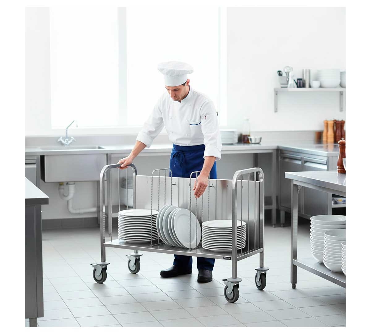 Este carro porta platos está equipado con estantes inclinados hacia el interior, para evitar que los platos se caigan.