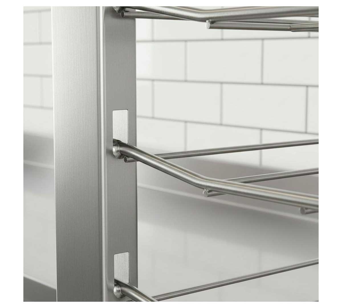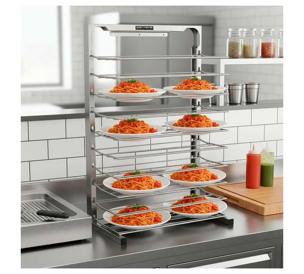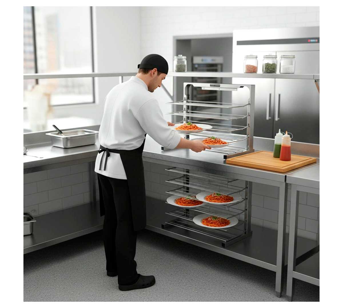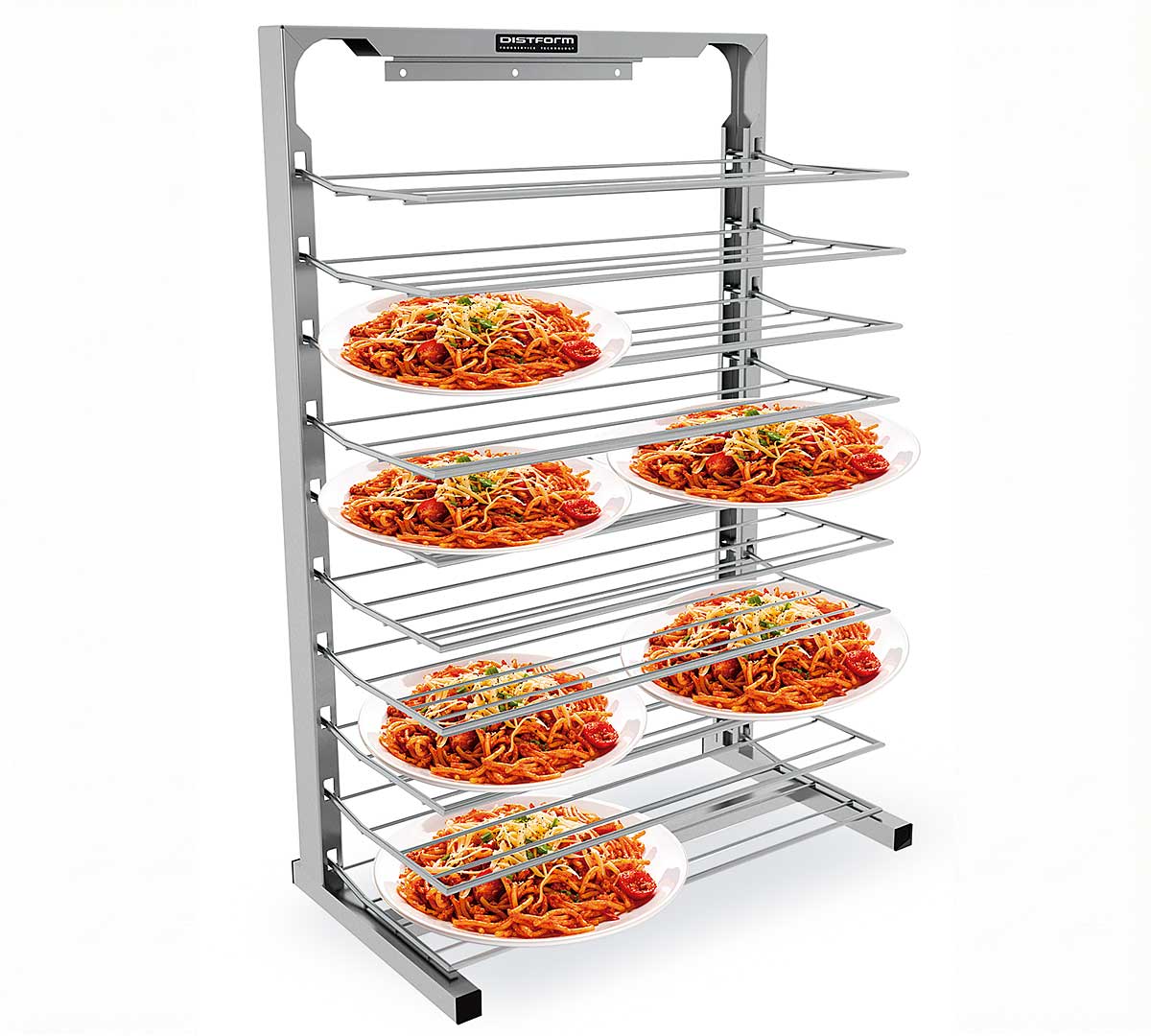 Este carro porta platos diseñado para emplatar platos en cocinas de producción media. Depende de las dimensiones de los platos este carro soporta una carga máxima de 20 o 30 platos.
