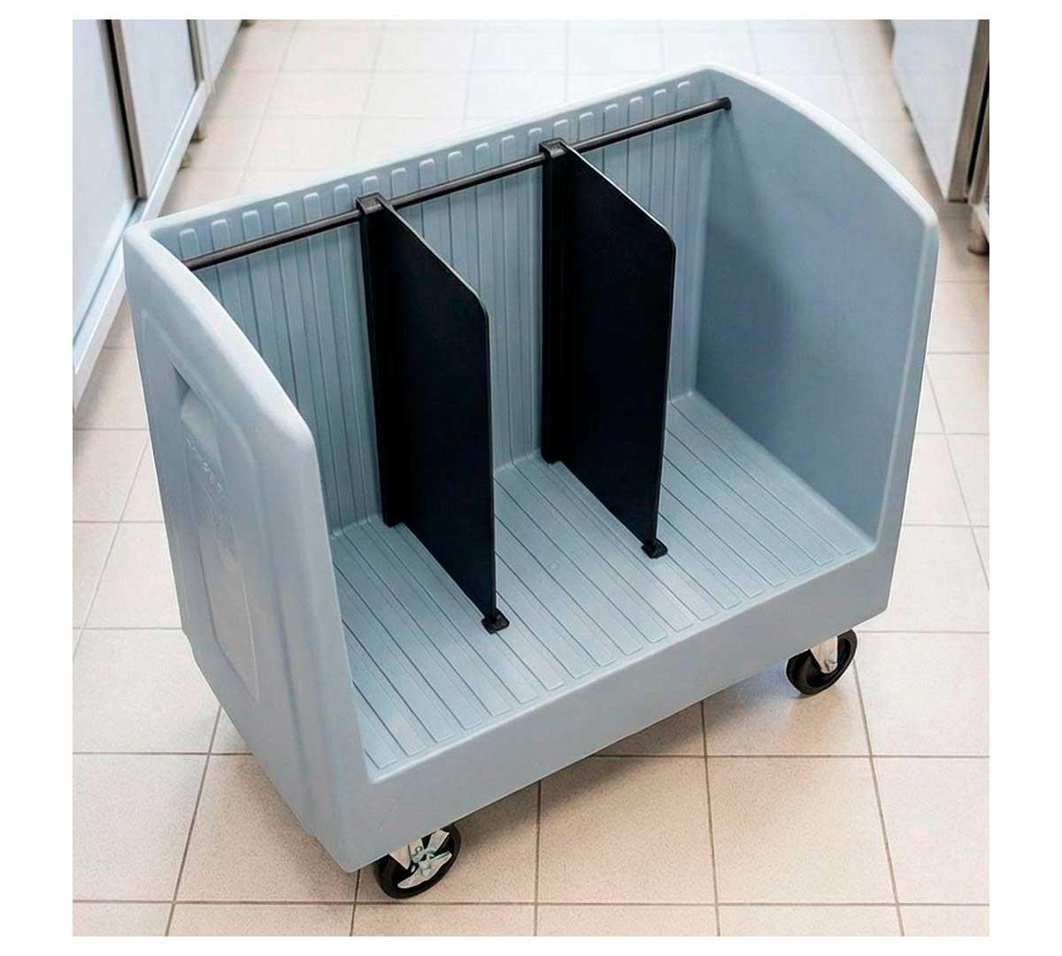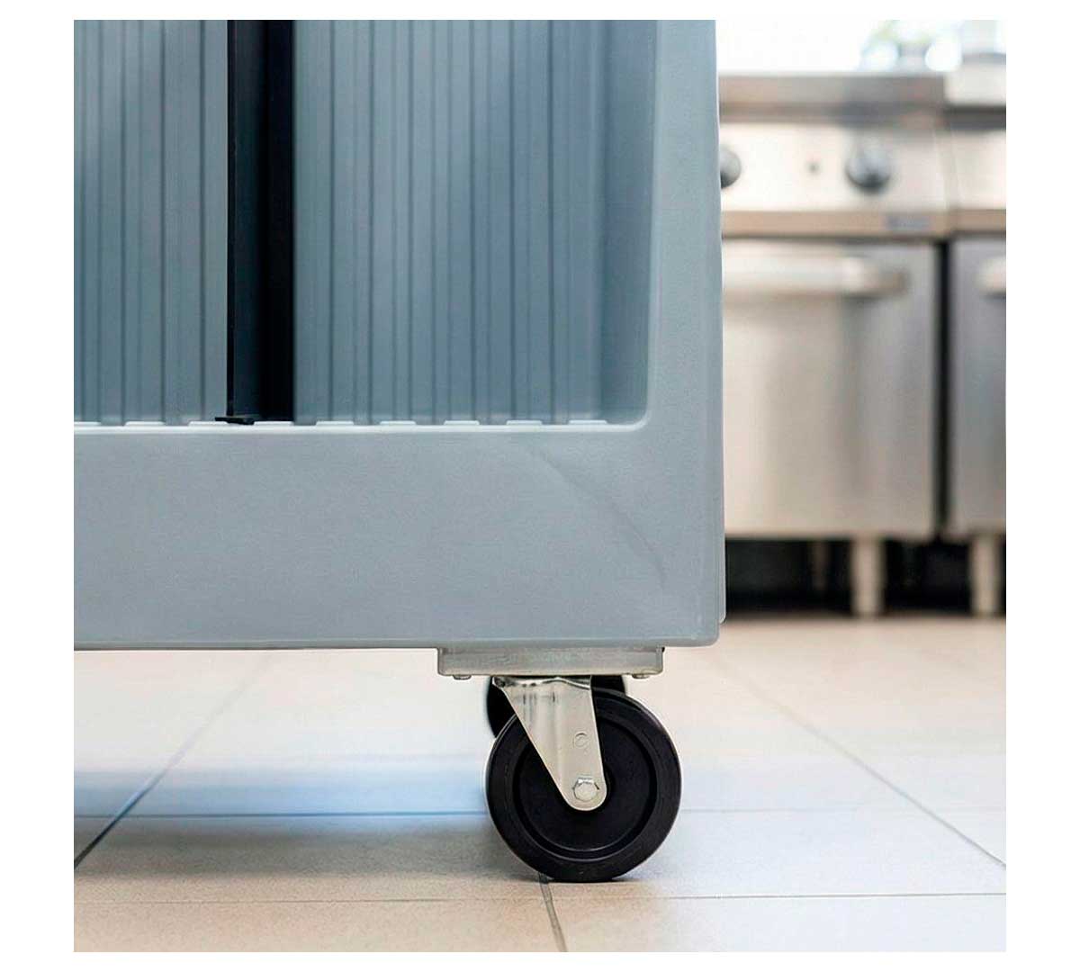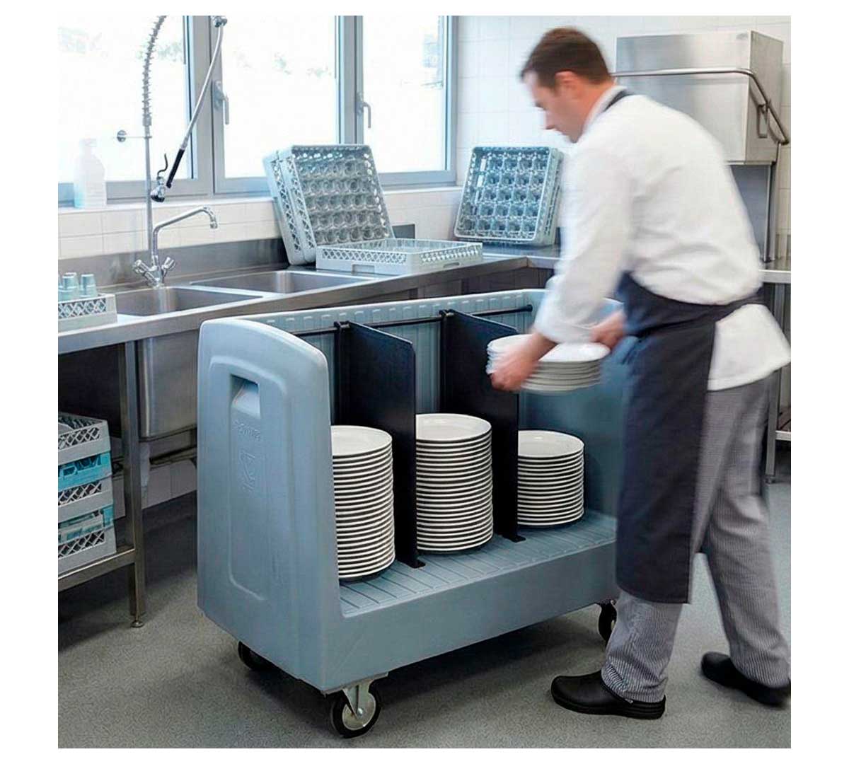 Carro con abertura en un lado para colocar platos y bandejas. Está fabricado en polietileno y tiene un espacio interior útil de 86,4 x 41,3 cm. Incluye funda protectora para mantener limpios los platos almacenados, 1 guía y 2 divisores.