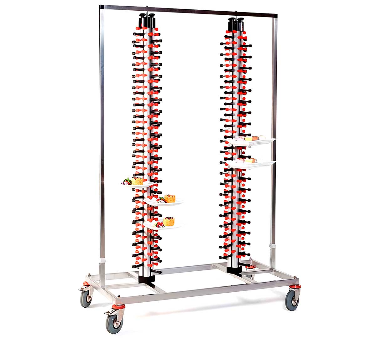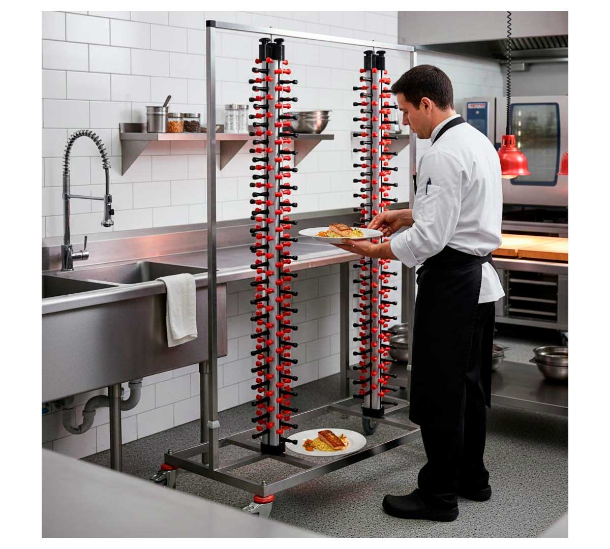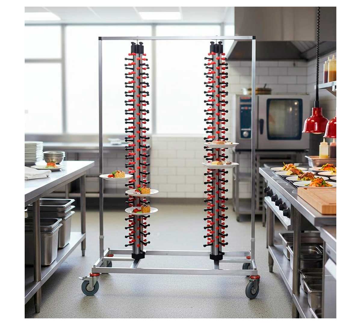Carro porta plato equipado con 2 columnas que pueden girar de forma independiente. Tiene capacidad para 168 platos.