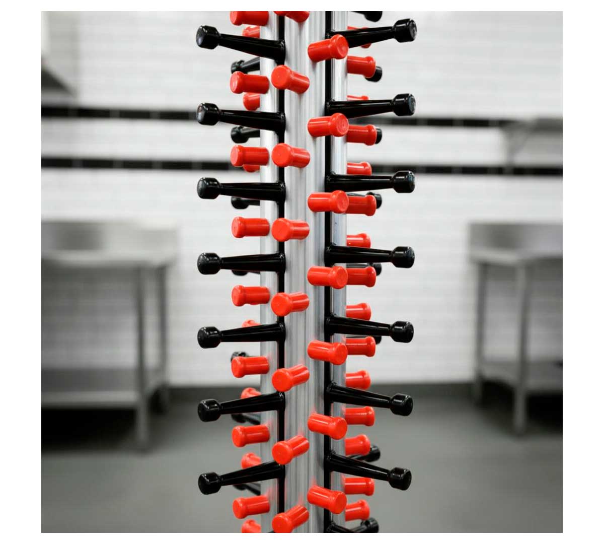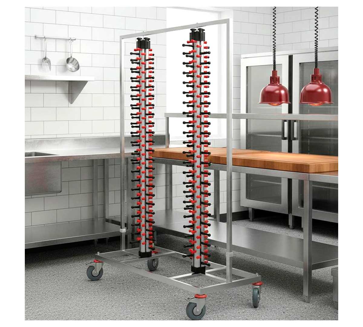 Esta carro porta platos está equipado con 2 columnas que tienen 84 soportes de platos, cada una. Estas columnas giran de manera independiente, lo que facilita el trabajo a los trabajadores.