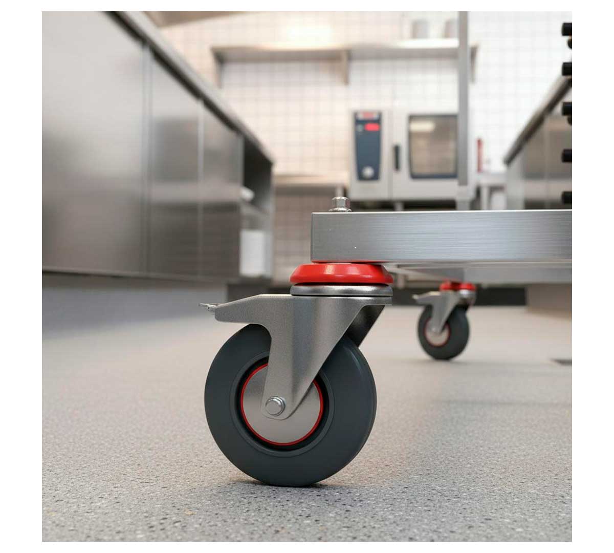 Este producto tiene capacidad para 168 platos. Está equipado con 4 ruedas giratorias con un diámetro de 12,5 cm. Tiene 2 ruedas con freno. Este producto es perfecto para almacenaje y transportar platos.