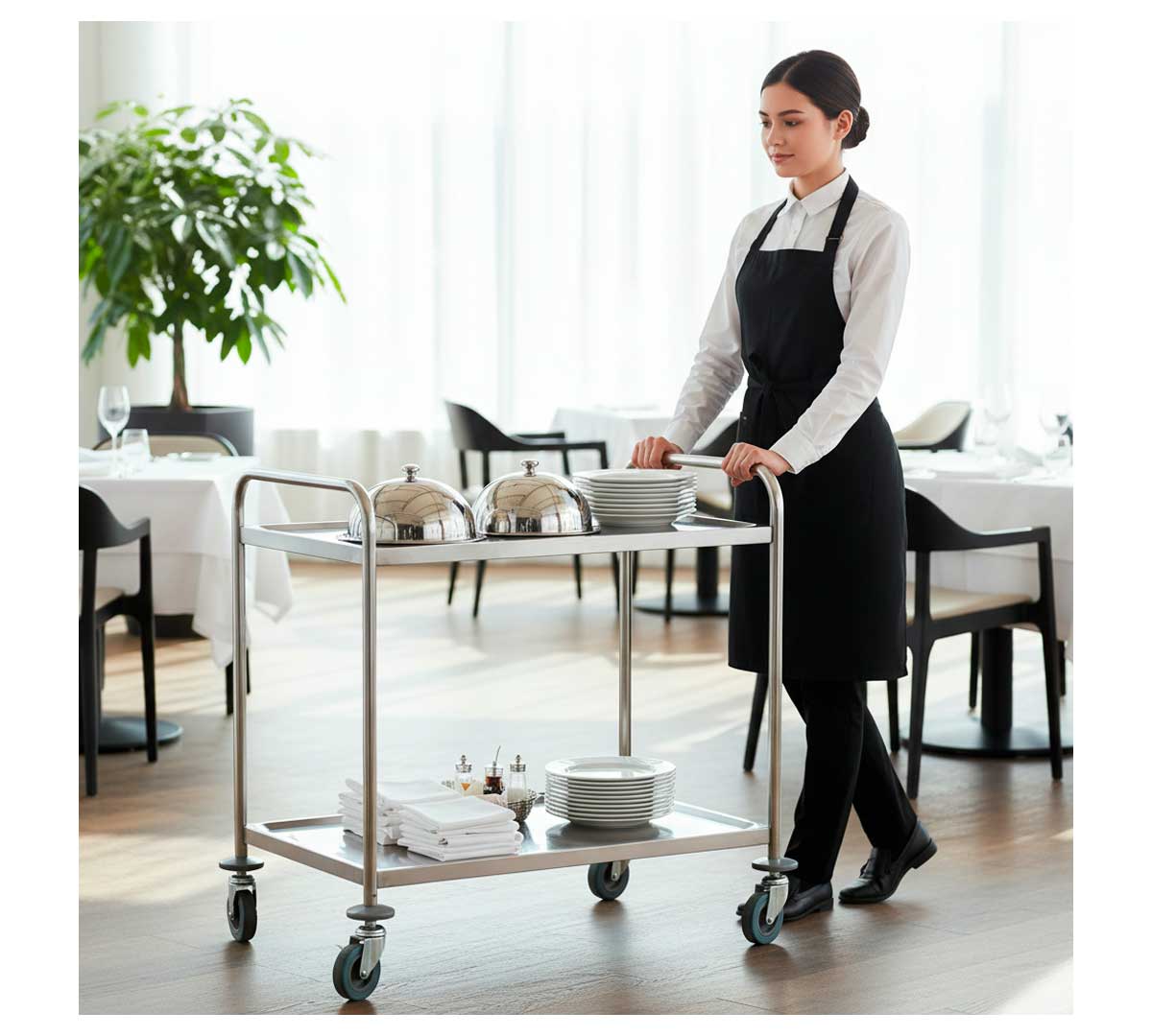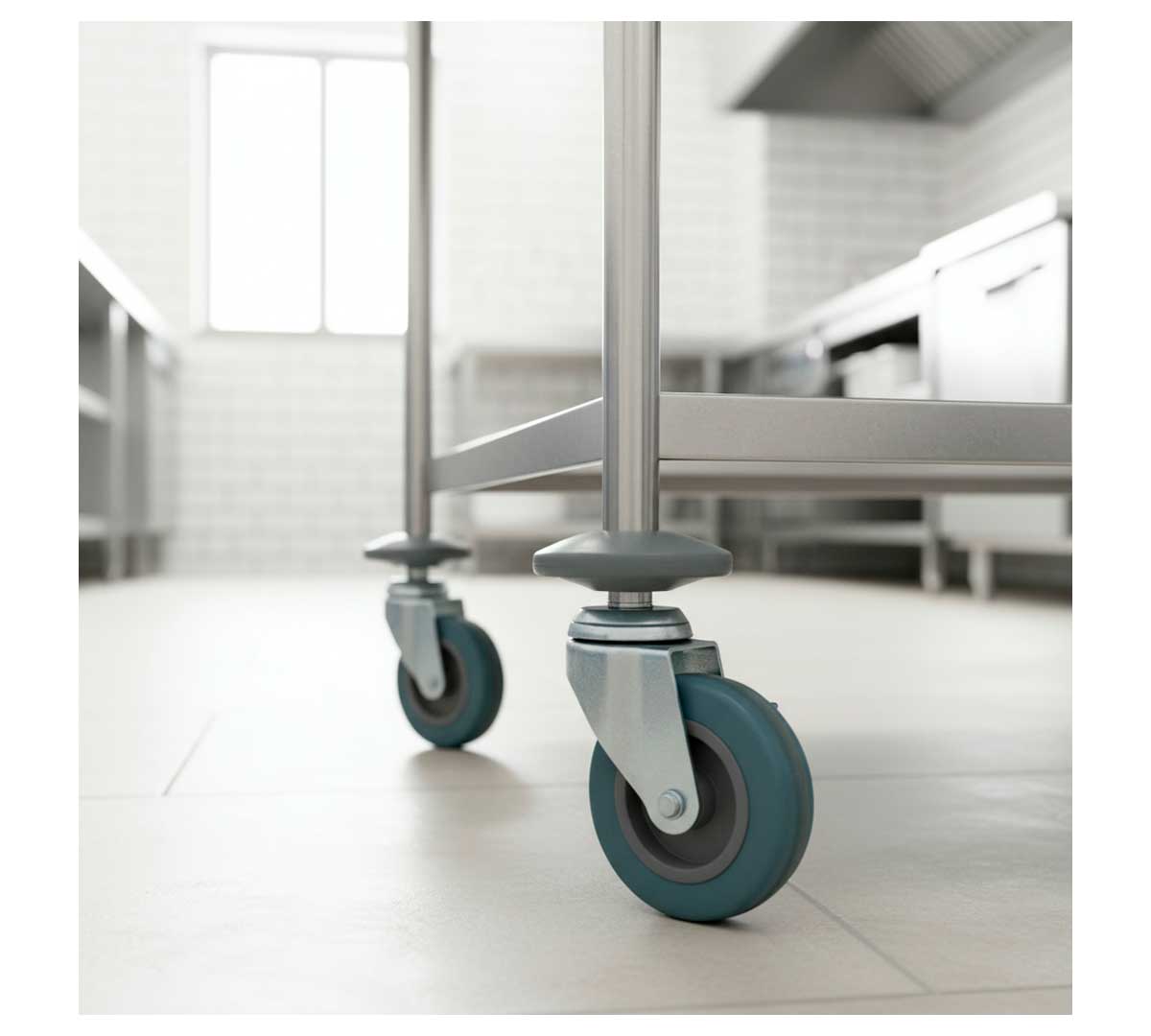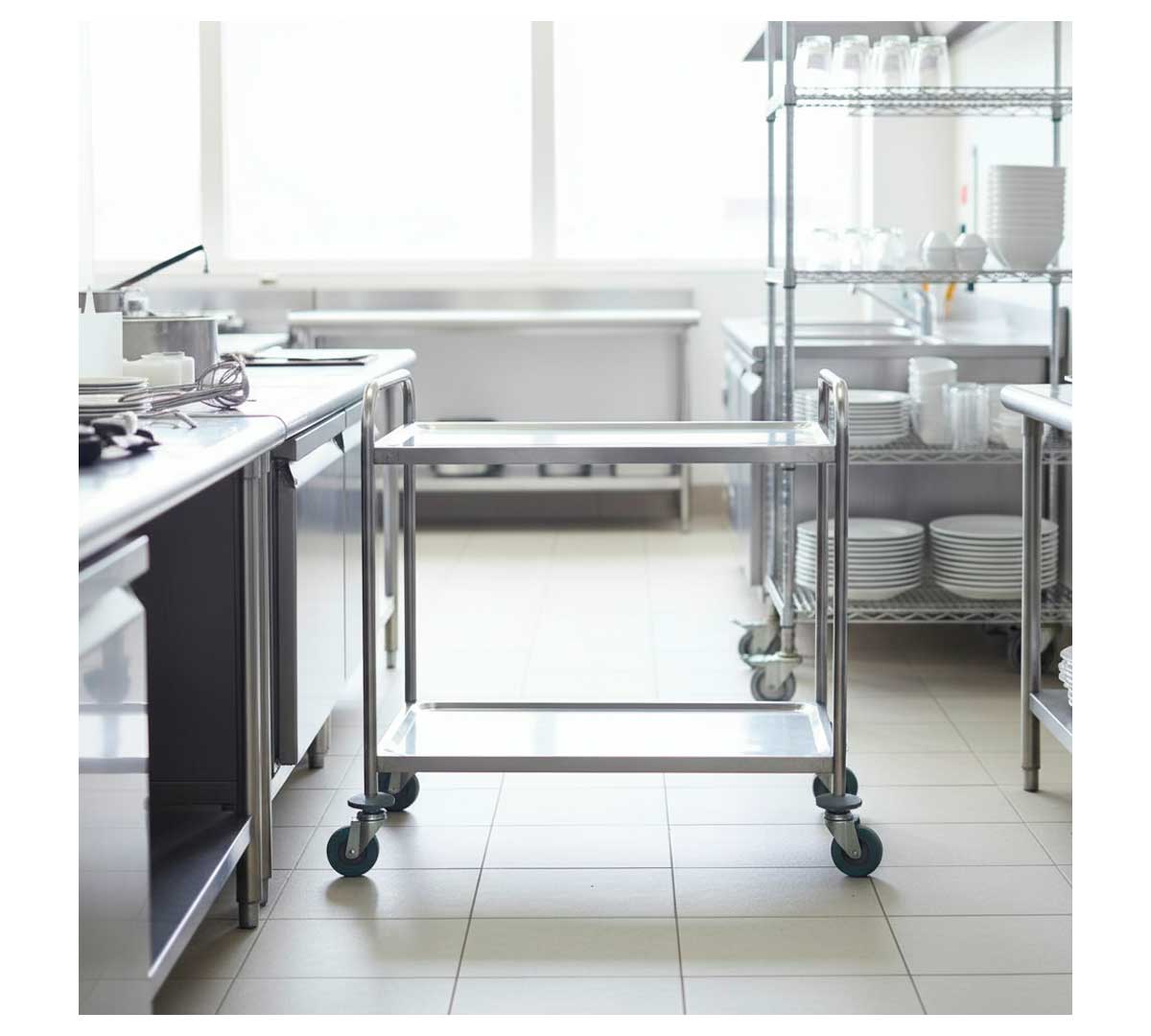 Carro de servicio con 4 ruedas de goma y dos estantes con superficies redondeadas e insonorizadas. Su carga máxima es de 120 kg y parcial por estante es de 60 kg. Se suministra desmontado.