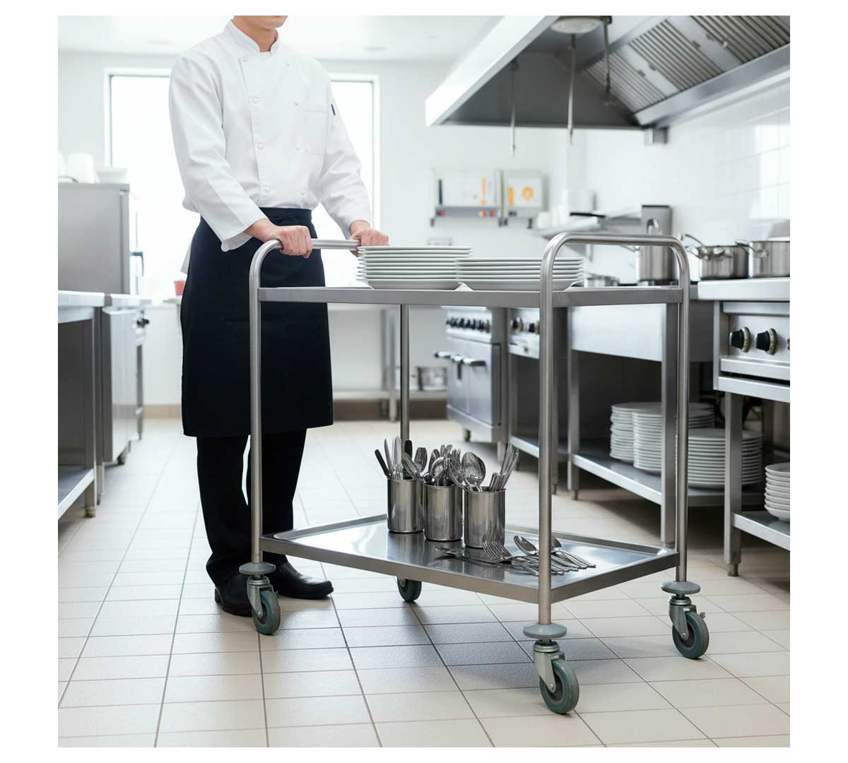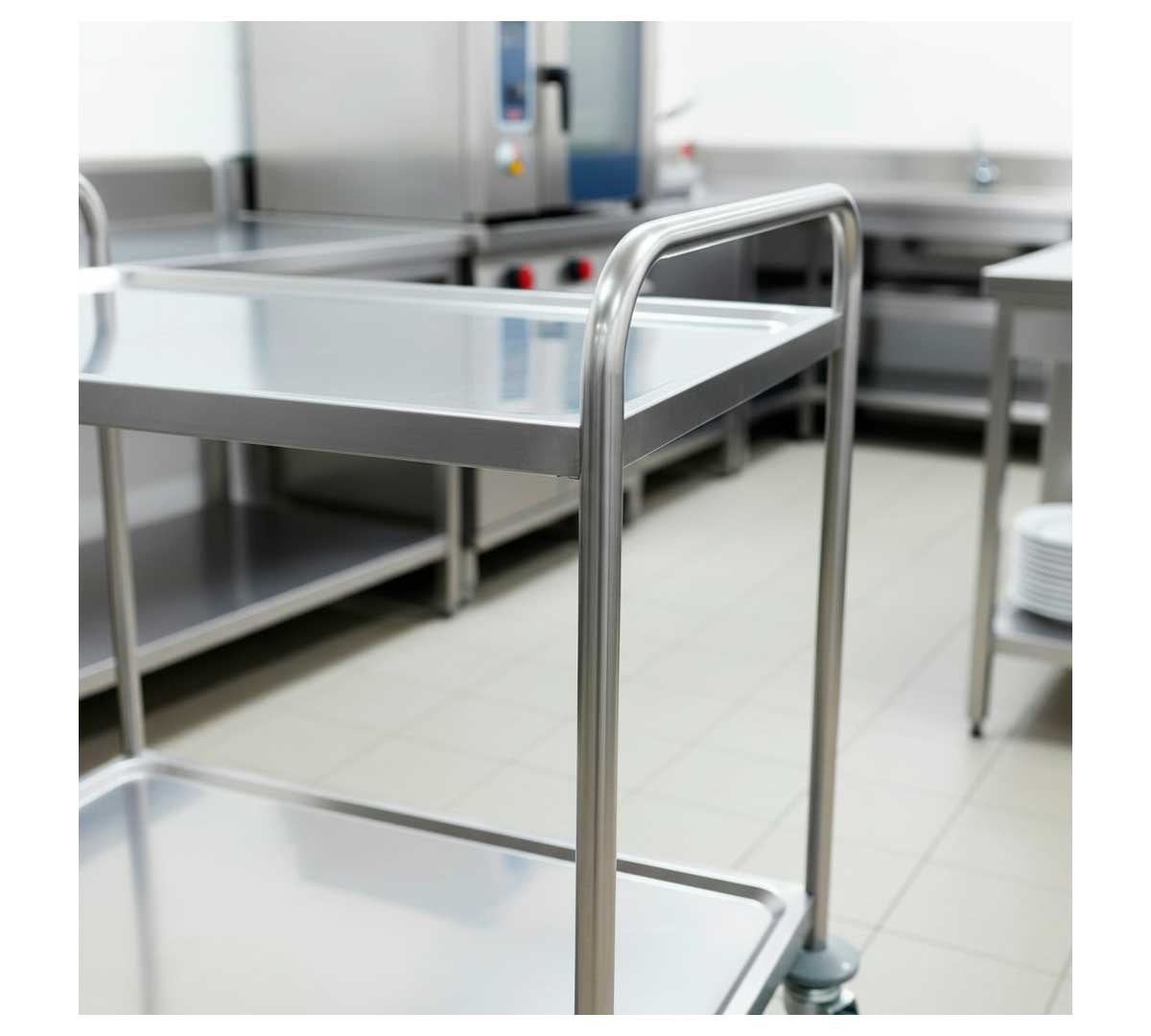 El Carro de Servicio de Irimar está fabricado en acero inoxidable y tiene 2 estantes embutidos con superficies redondeadas e insonorizadas. Se suministra desmontado
