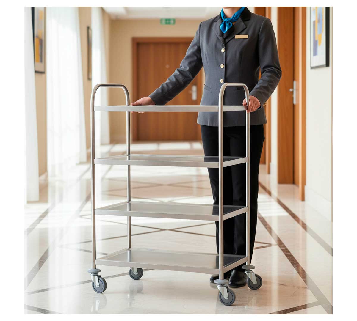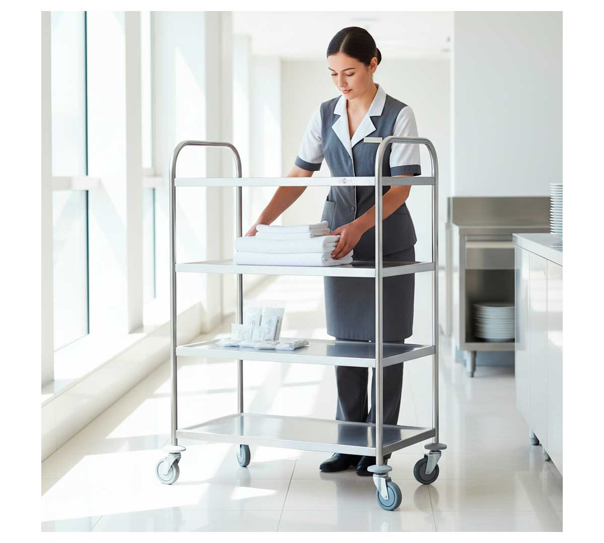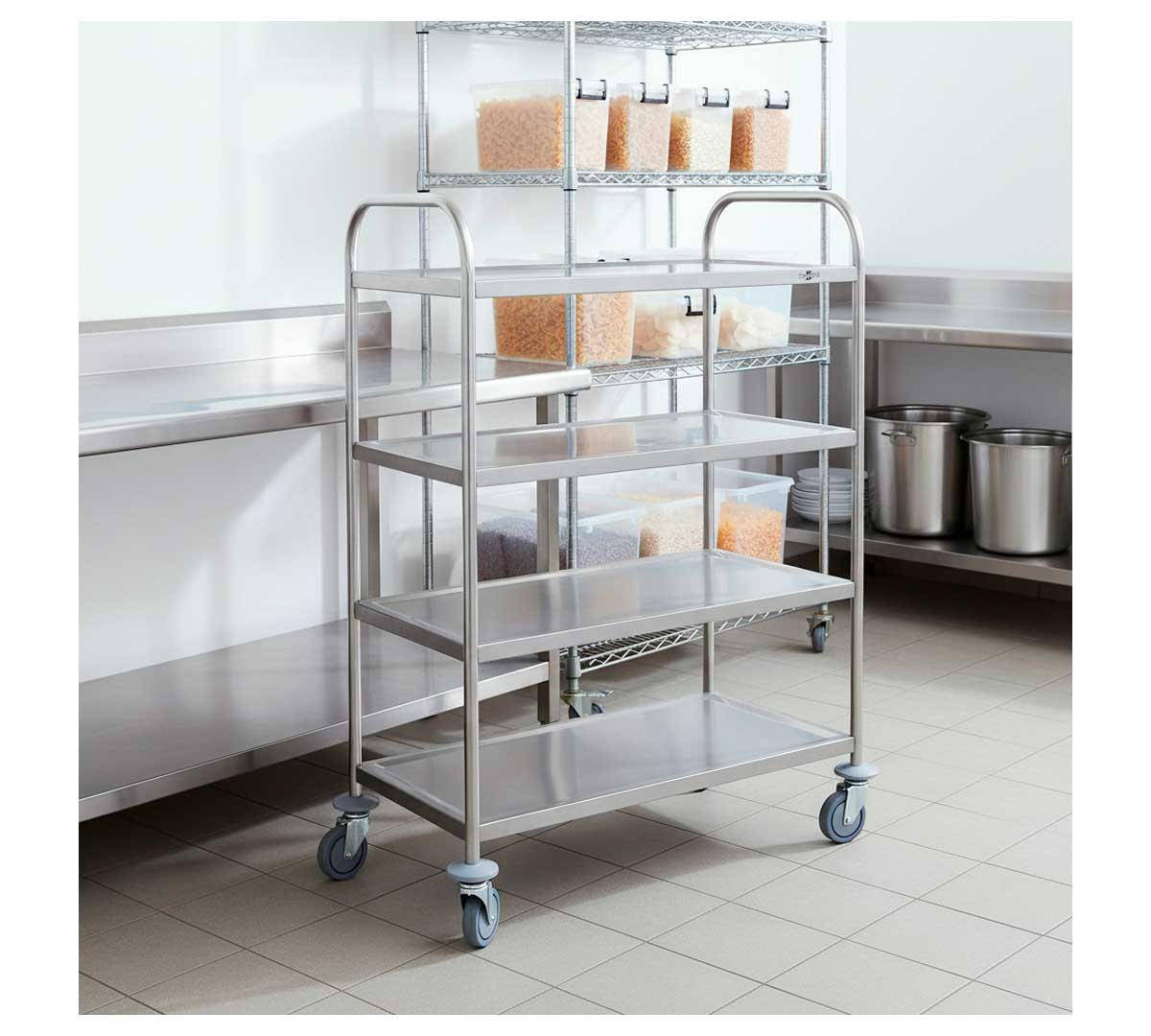 El Carro de Servicio 4 Estantes de Irimar está fabricado en acero inoxidable y tiene los estantes embutidos con superficies redondeadas e insonorizadas. Se suministra desmontado
