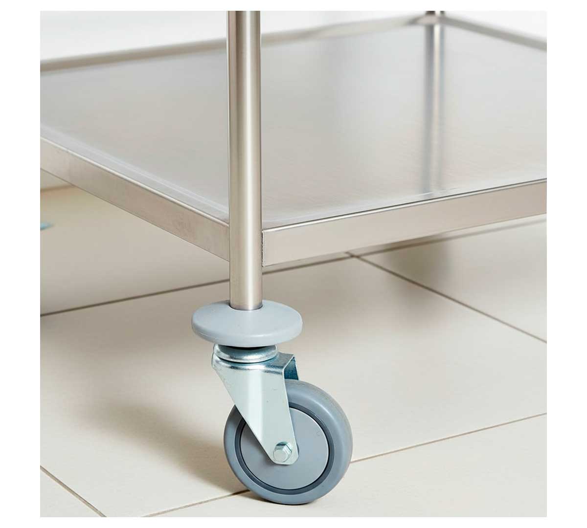 Carro de servicio con cuatro estantes con superficies redondeadas e insonorizadas. Tiene 4 ruedas de goma. Su carga máxima es de 240 kg y parcial por estante es de 60 kg. Se suministra desmontado.