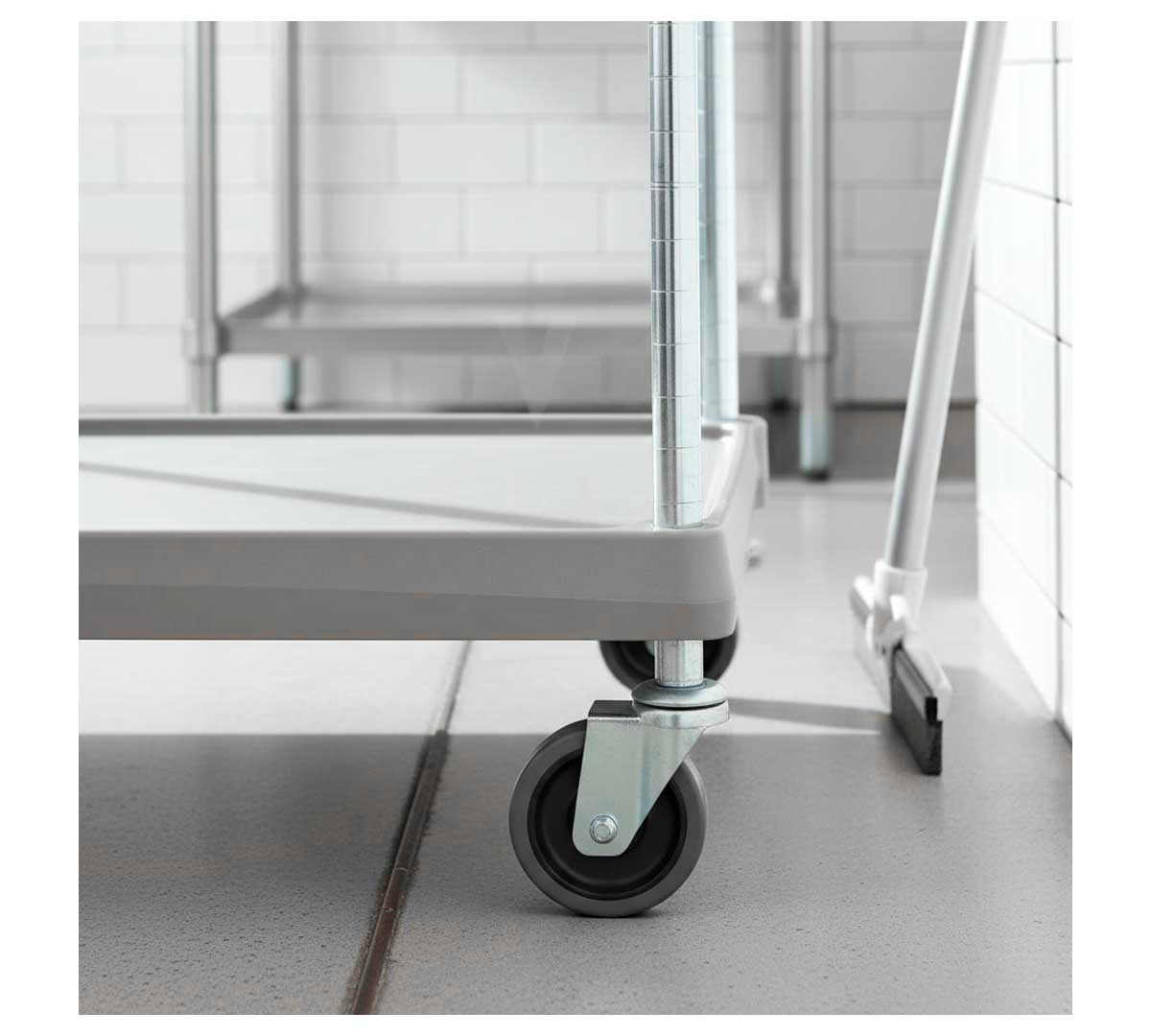 Carro de servicio con cargas máximas de 136 o 182 kg según modelo. Tiene un espacio extra para las piernas, asa ergonómica y cuatro ruedas pivotantes. Con una pequeña bandeja en el estante superior para organizar objetos pequeños.