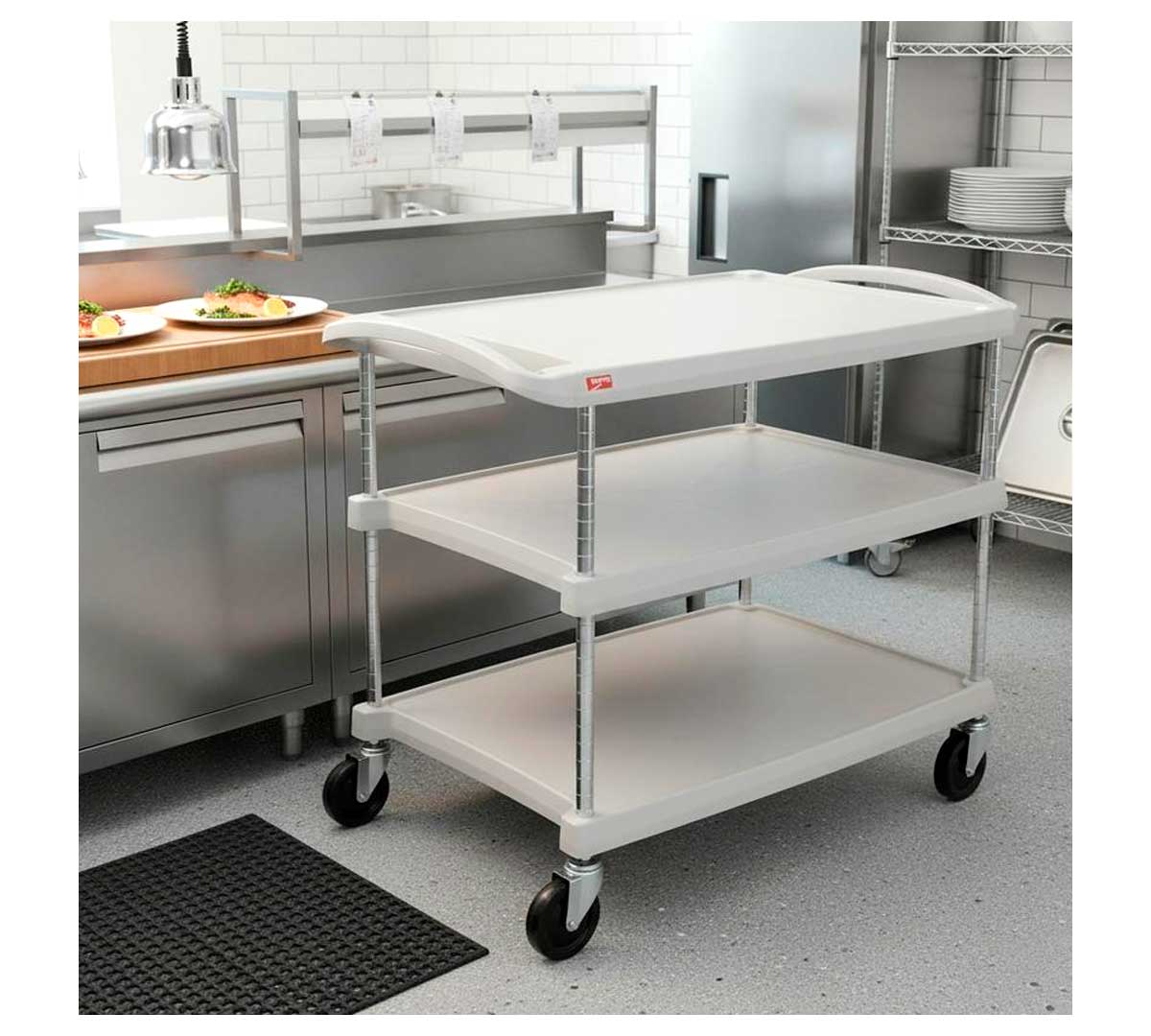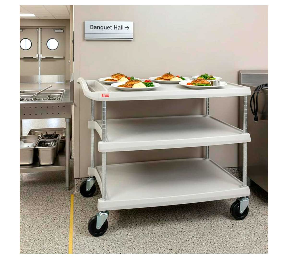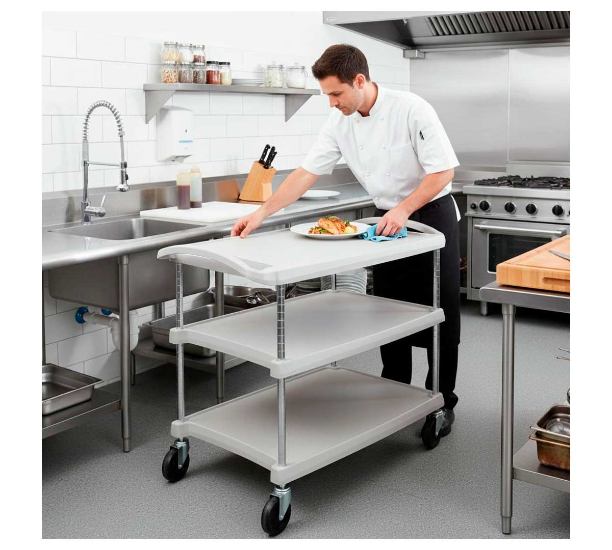 Carro de servicio con estructura de polietileno y acero cromado. Tiene un espacio extra para las piernas y una carga máxima de 182 o 227 kg según modelo. Con una pequeña bandeja en el estante superior para organizar objetos pequeños.
