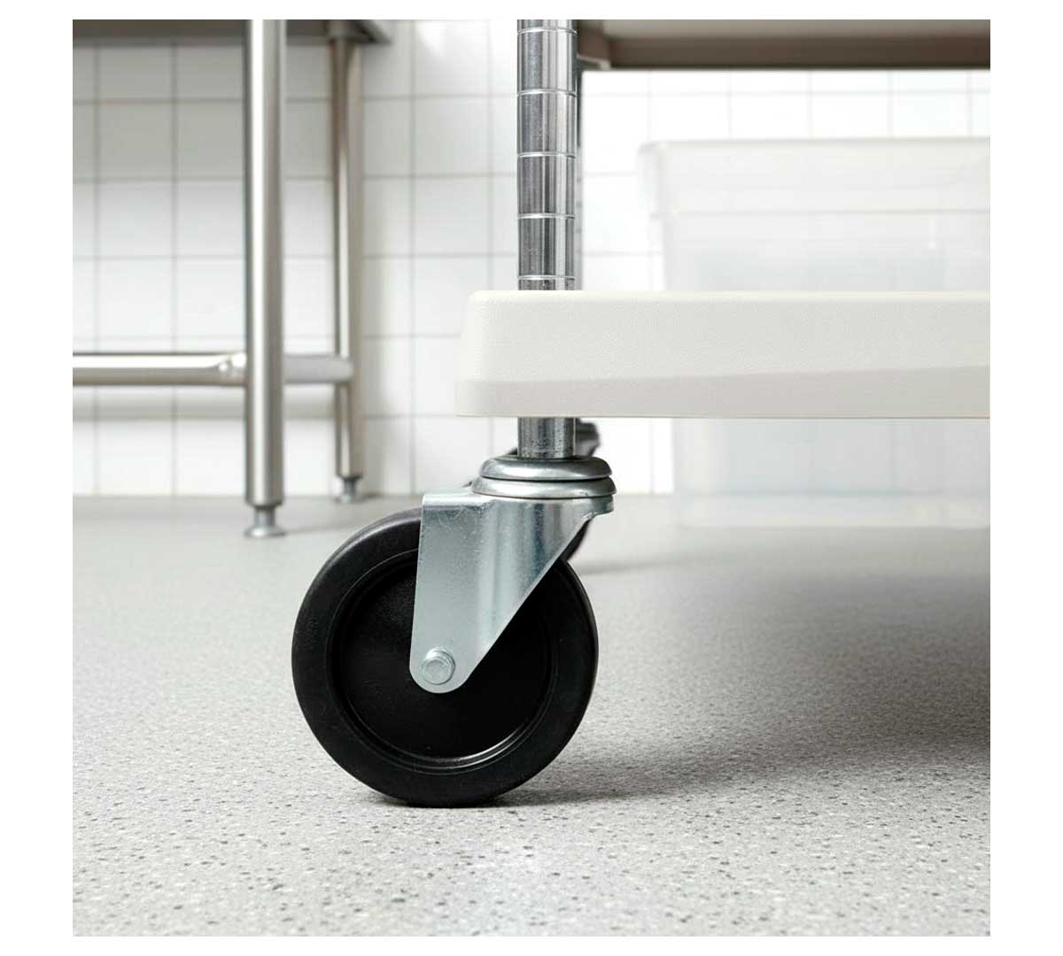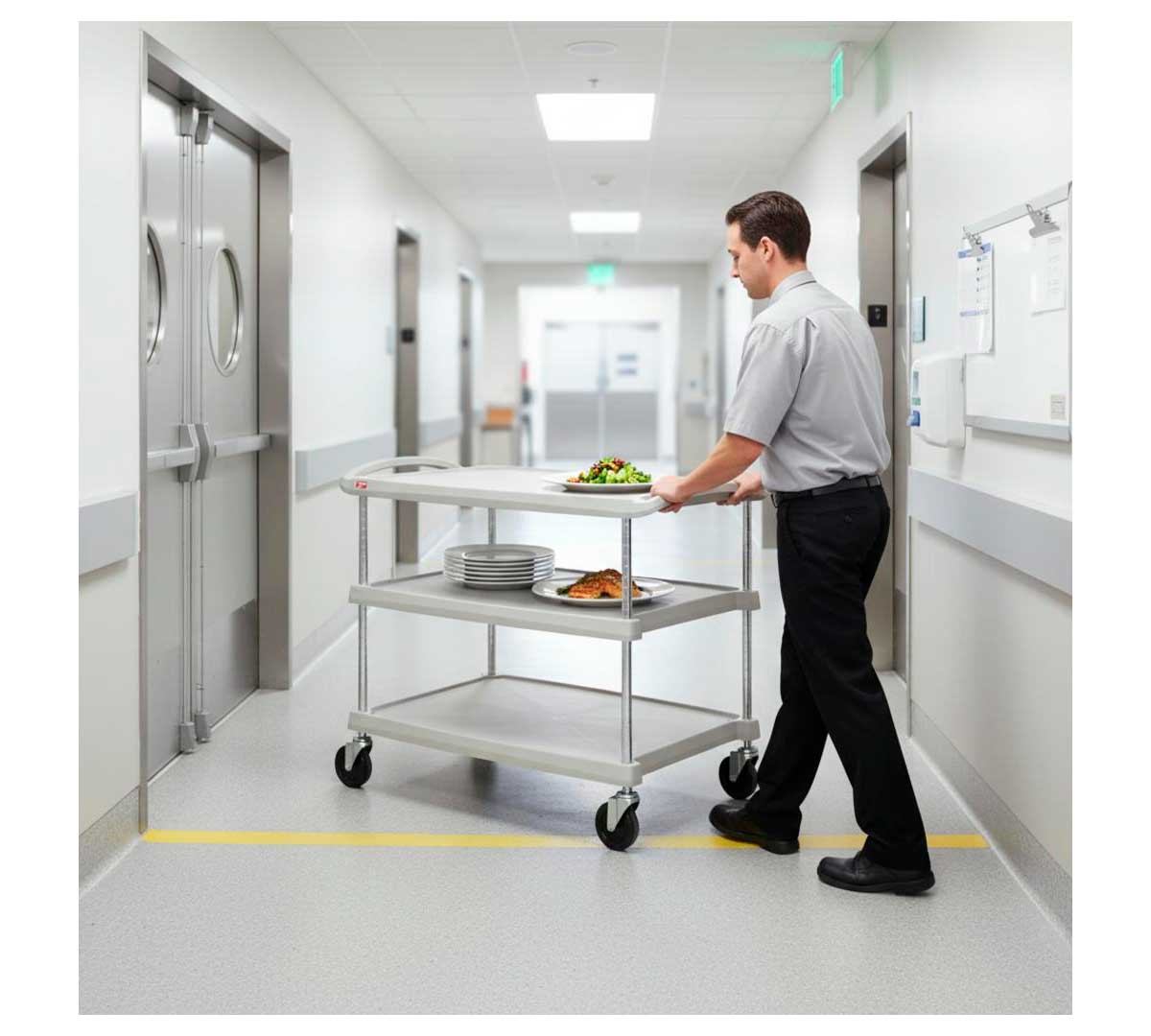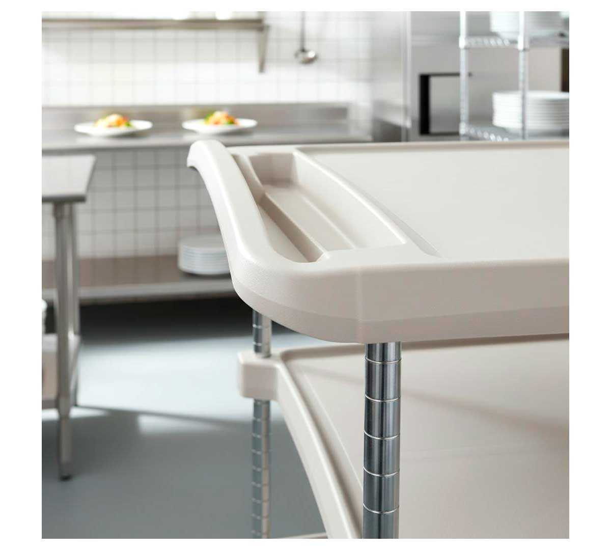 Carro de servicio con estructura de polietileno y acero cromado. Tiene un espacio extra para las piernas y una carga máxima de 182 o 227 kg según modelo. Con una pequeña bandeja en el estante superior para organizar objetos pequeños.