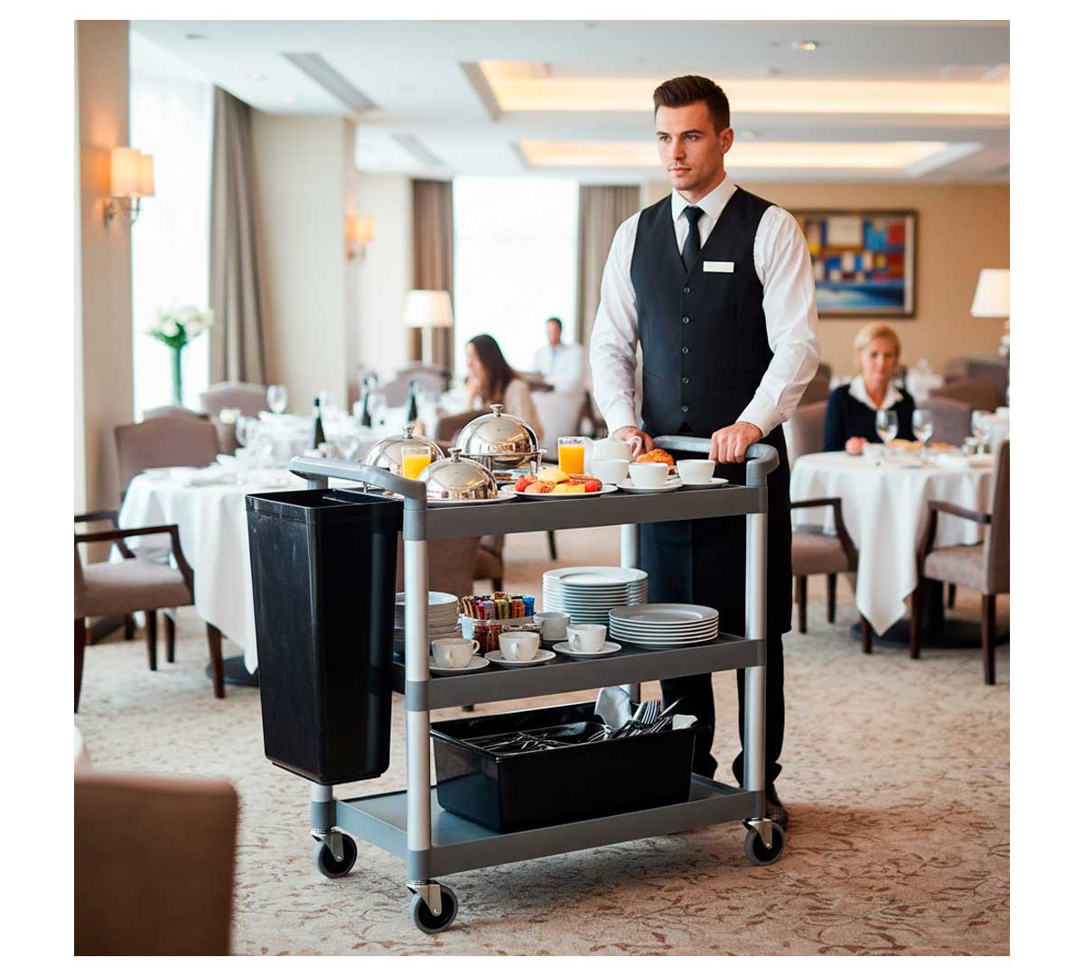 Carro para el transporte de platos y útiles de servicio de mesas. Está fabricado en aluminio y plástico. Tiene una carga máxima de 120 kg. Está disponible con o sin cubetas.