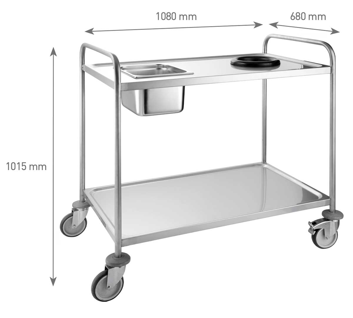 Carro de desbarace con capacidad para 1 cubeta GN 1/2 (no incluida). Está fabricado en acero inoxidable y las ruedas tienen un diámetro de 16,5 cm.