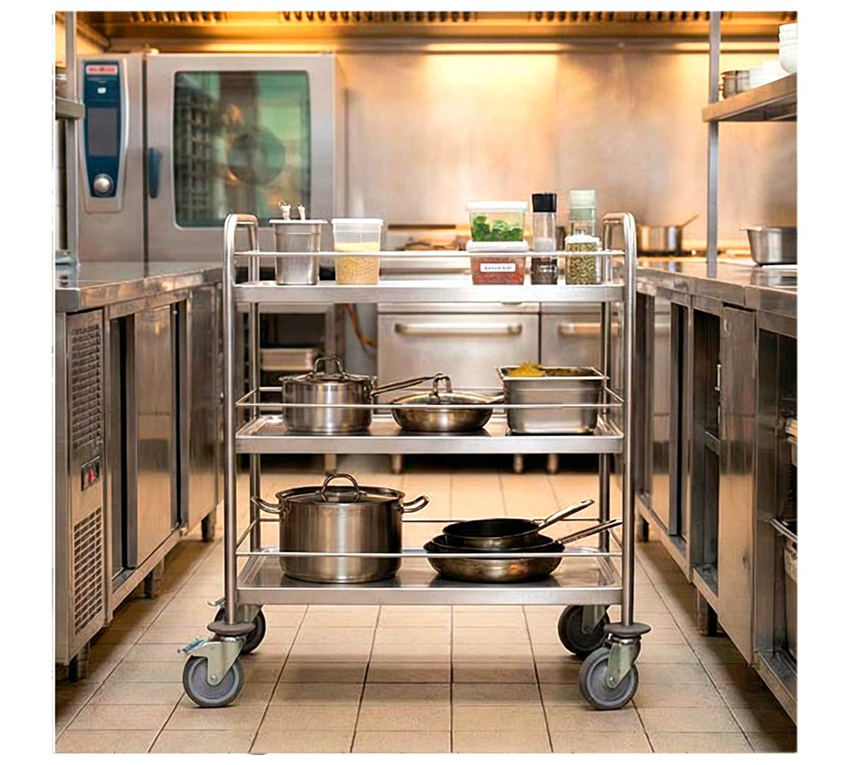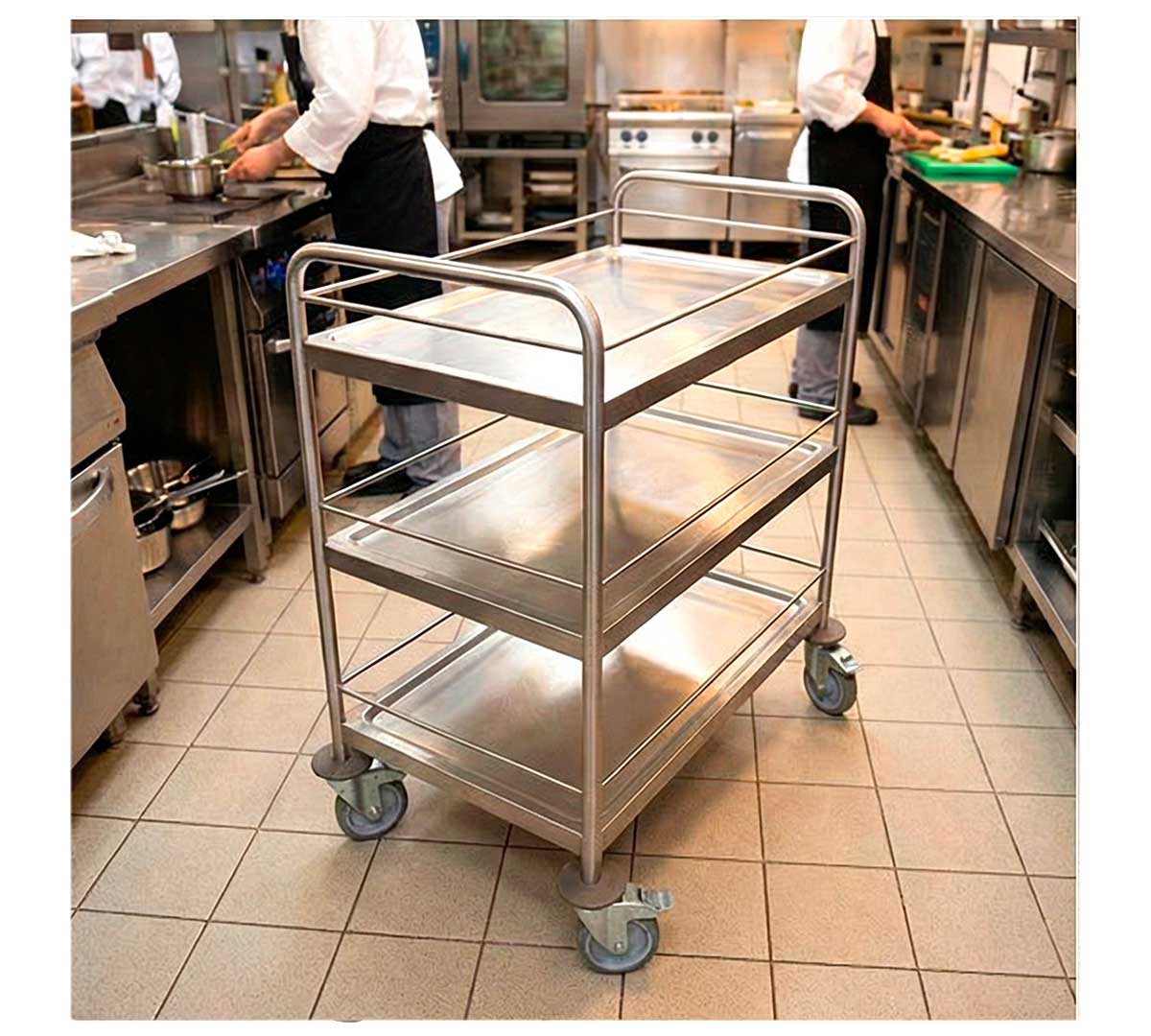 Carro de servicio con 3 estantes y barandilla fabricado en acero inoxidable. Su carga máxima es de 250 kg y la parcial por estante es de 80 kg.