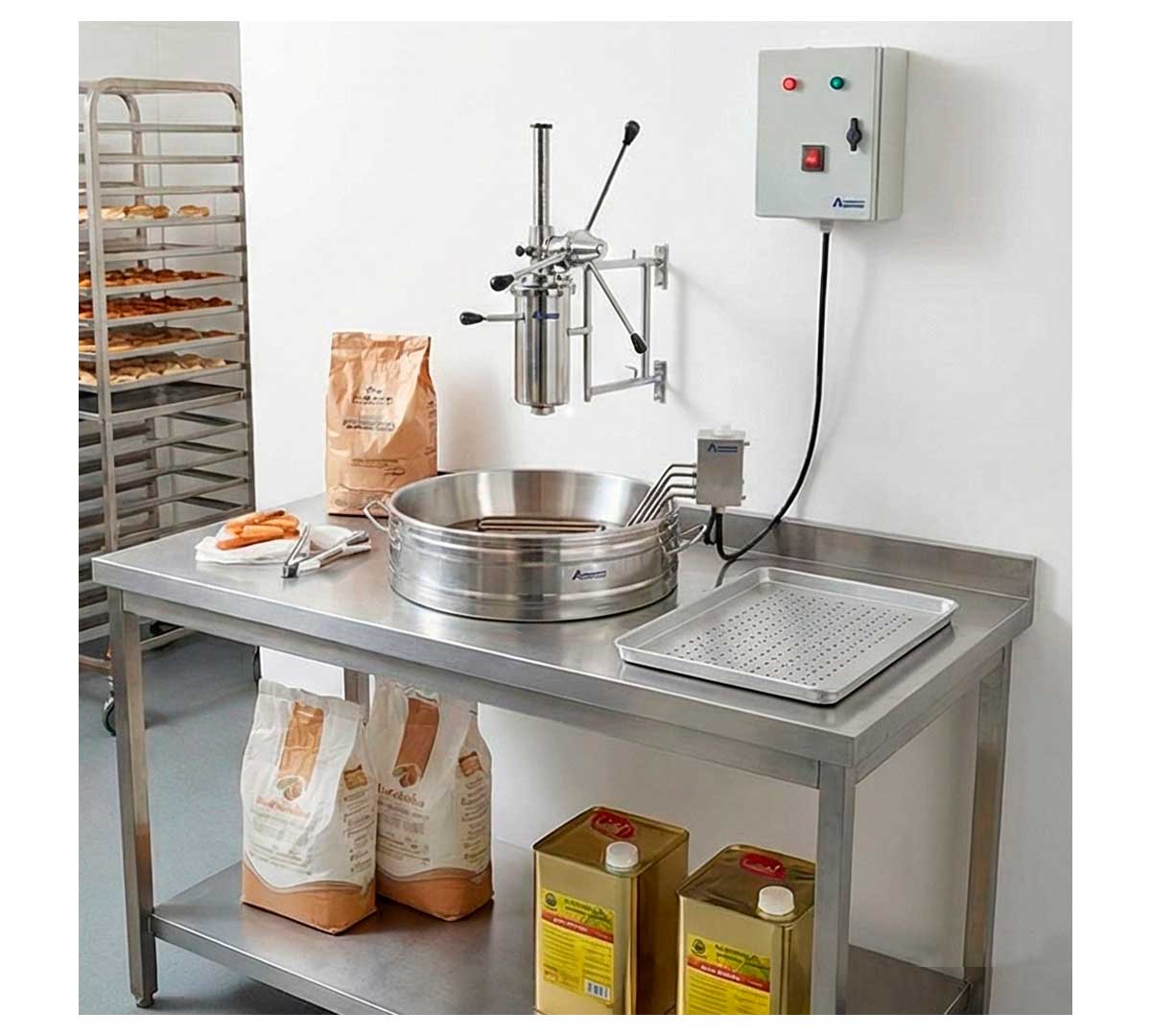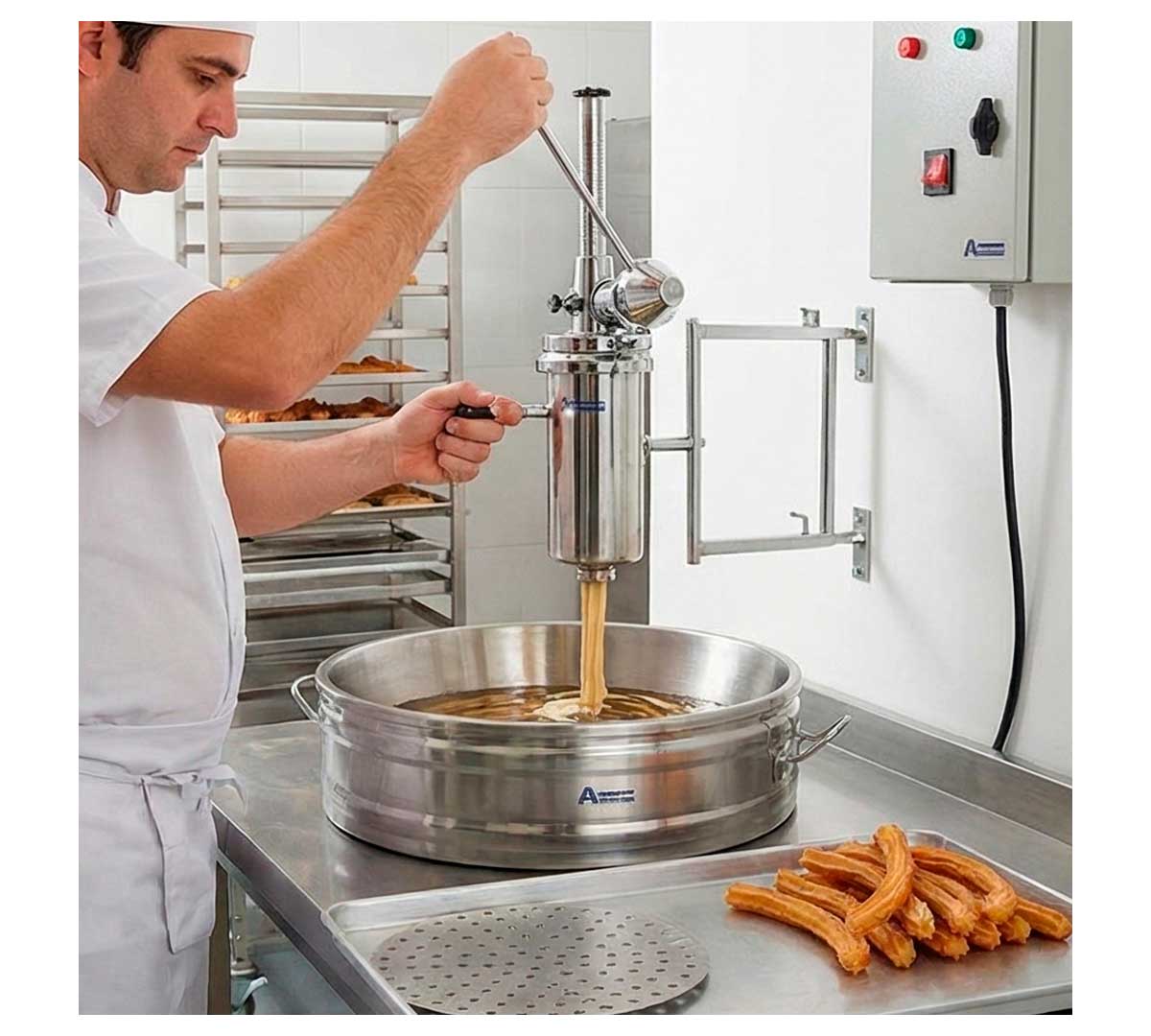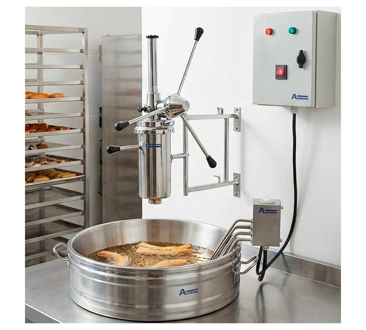 Kit completo para elaborar pequeñas producciones de churros. Incluye dosificador de masas, sartén de acero inoxidable, resistencia, cuadro eléctrico y chapa perforada de acero inoxidable para cubrir la resistencia. El dosificador tiene una capacidad para 4,5 kg de masa. Se suministra con una boquilla de churros de 6 puntas y una boquilla de churros de 8 puntas.