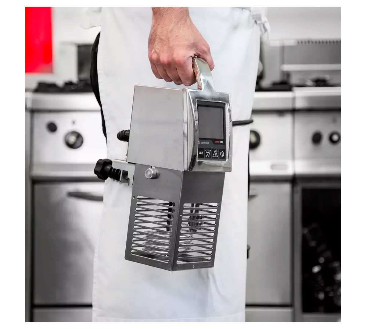 Roner portátil profesional de temperatura controlada con gran precisión. Provisto de agitador para recipientes de hasta 56 litros. Garantiza un acabado óptimo de los platos, resaltando su sabor y textura, infusiona y aromatiza, además de reducir los tiempos de marinado. Con estructura y asa de acero inoxidable.
