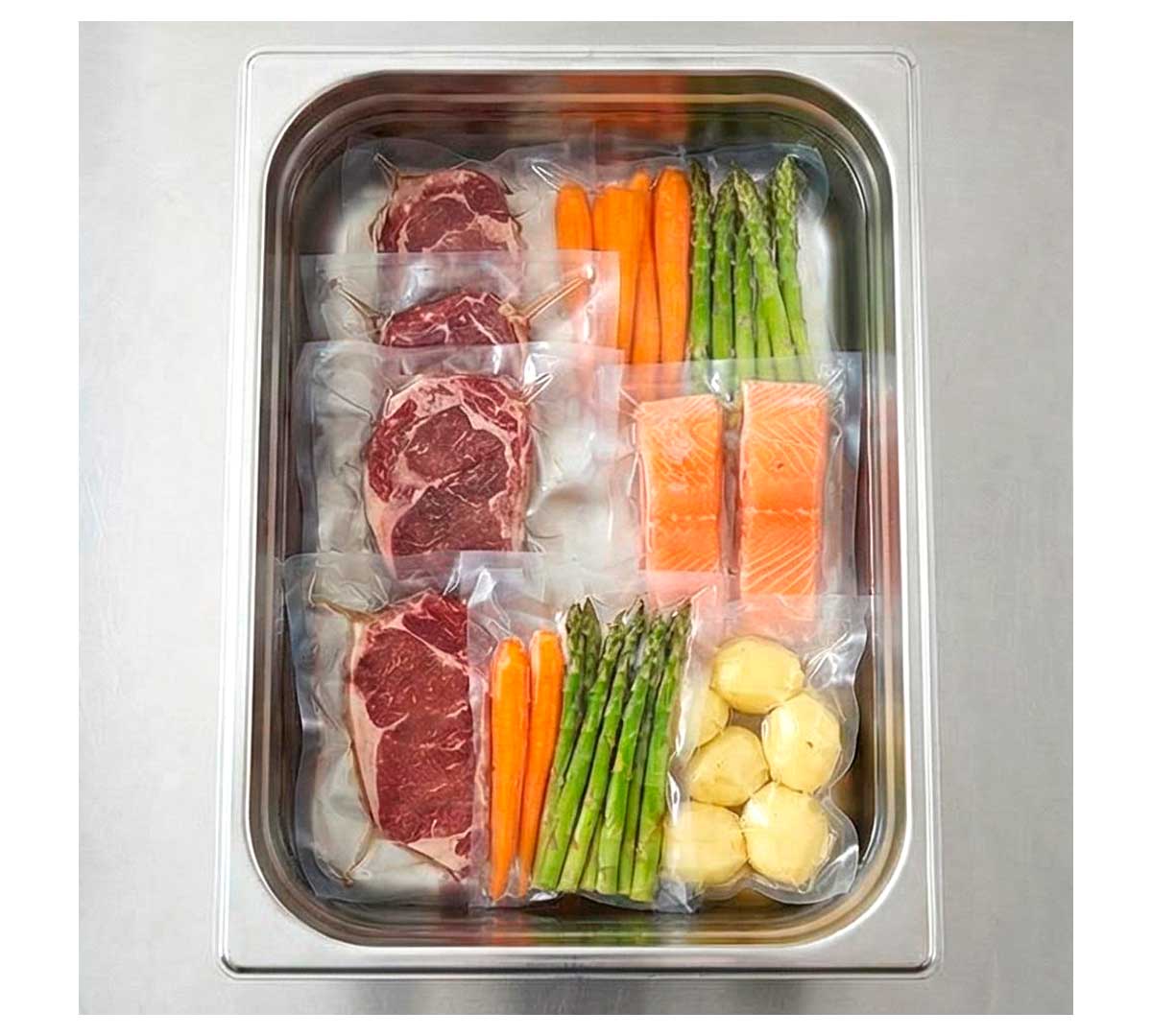 Cubas neutras fabricadas a medida para los equipos SmartVide. De acero inoxidable, están equipadas con un grifo de vaciado. Proporcionan aislamiento térmico y ahorro energético. Disponible en GN 2/1 de 56 litros y en GN 1/1 de 28 litros.