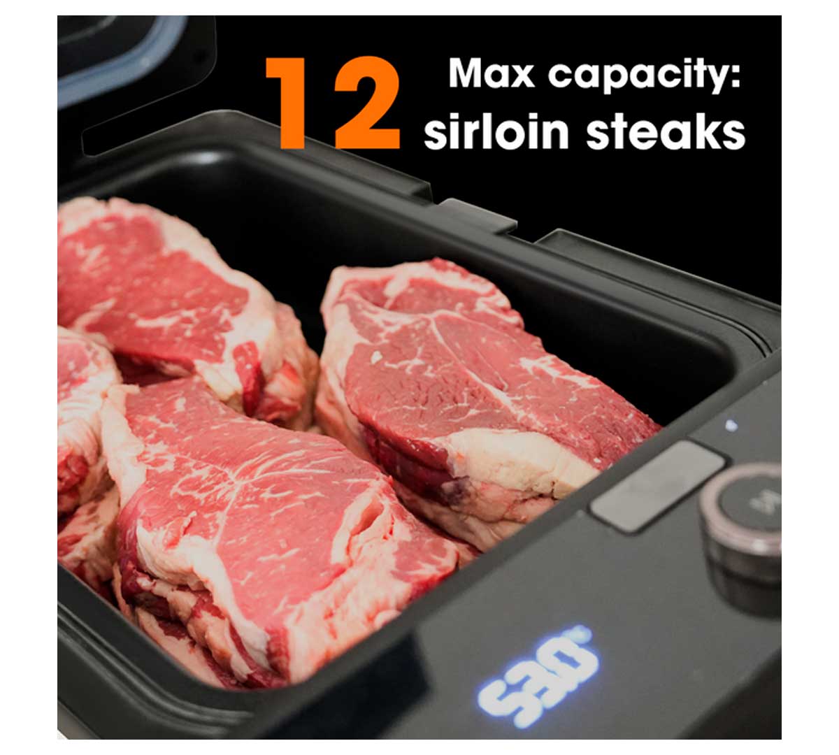 La bandeja del Neovide NSV500 tiene 8,6 litros y una cámara de 380 × 260 × 90 mm. En la práctica te permite trabajar varias raciones a la vez, ya sea en bandeja directa, con líquido o con bolsas al vacío sumergidas. Para saber cuántas piezas concretas caben de tu formato (por ejemplo, costillas o lomos grandes), depende del modelo, consulta la ficha técnica.