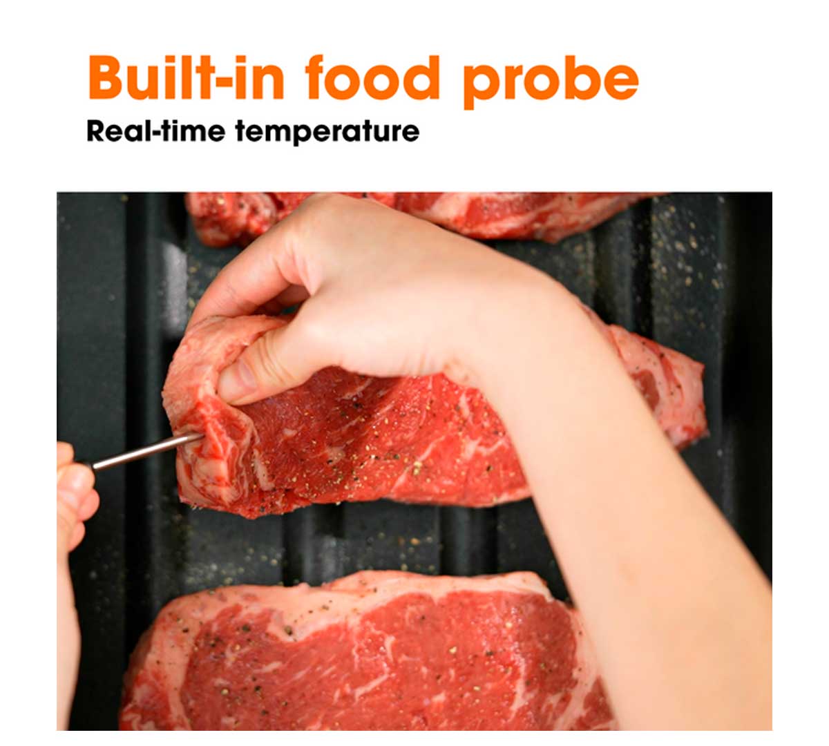 El modo Neovide del Vesta Neovide NSV500 está pensado para piezas regulares tipo entrecot, chuletas, pechuga de pollo o lomos de pescado. Ahí clavas la sonda en el centro y el equipo controla la temperatura del corazón del producto sin que tengas que preocuparte por el tiempo. Es útil cuando quieres repetir siempre el mismo punto, aunque cambie el grosor.