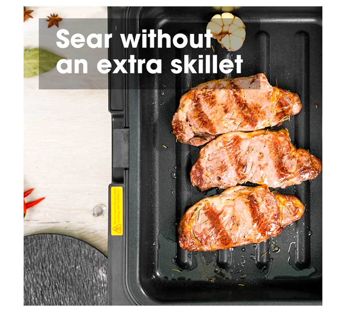 El modo Mild Sear del Neovide NSV500 convierte la bandeja en una superficie de acabado entre 150 y 210 ºC. Una vez cocinado a baja temperatura, abres la tapa, añades un poco de aceite y haces el marcado final dentro del propio equipo. Evitas manchar la plancha principal y puedes controlar tiempos de dorado con el temporizador específico de hasta 30 minutos.