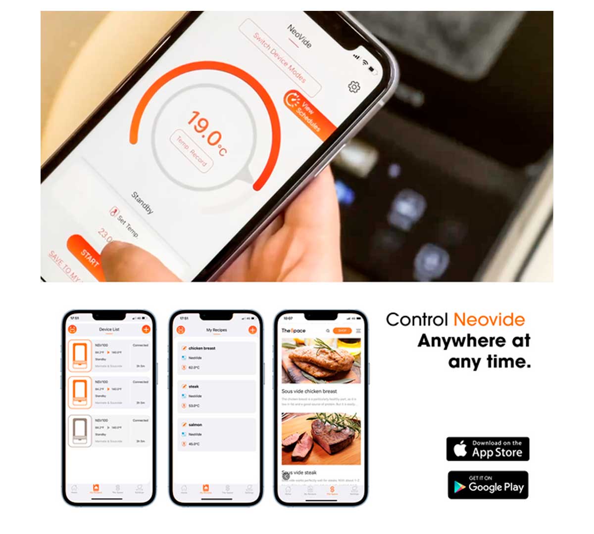 El Neovide NSV500 está orientado a la preparación de carnes, pescados, mariscos, verduras y elaboraciones listas para regenerar mediante cocción al vacío con control muy fino de temperatura. El modo NeoVide con sonda es especialmente adecuado para piezas de carne en porción (solomillos, entrecots, pechugas, chuletas) y pescados como salmón o lomos blancos, donde interesa controlar el punto exacto en el corazón.