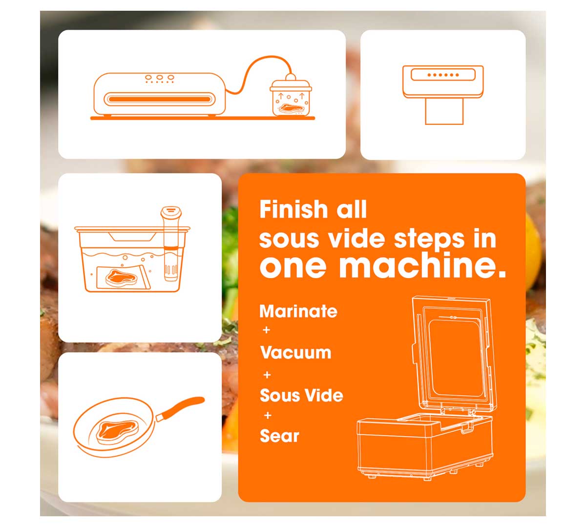 El modo Manual permite trabajar sopas, fondos, huevos o guarniciones vegetales, tanto con bolsas al vacío como directamente en bandeja con líquido. Los programas de marinado con vacío aceleran la penetración de adobos y salmueras, mientras que el modo Mild Sear facilita dar color y textura superficial a las piezas tras el sous vide sin cambiar de equipo.
