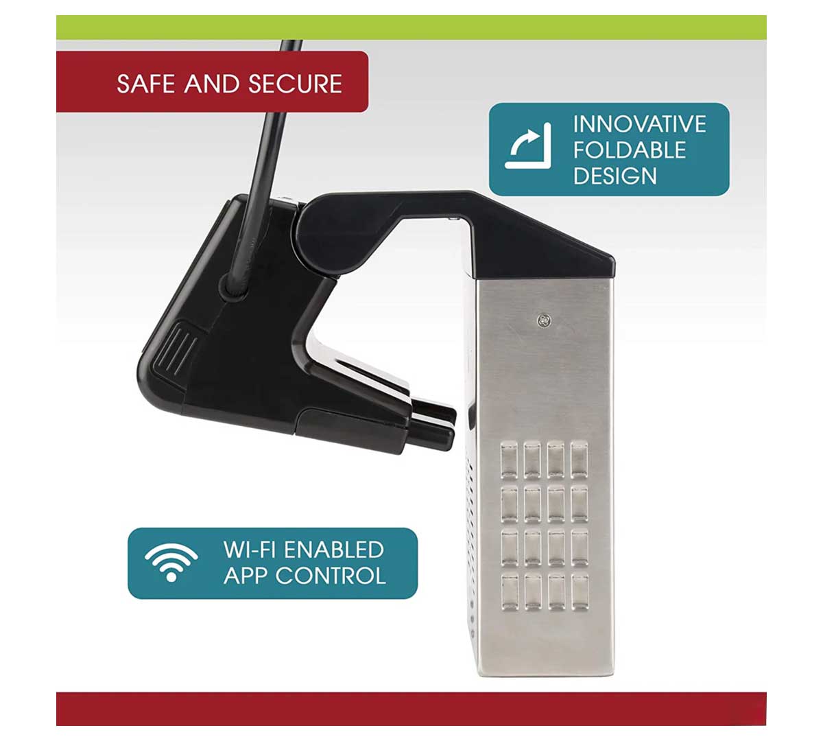 Circulador de inmersión sous vide compacto con diseño plegable, control mediante app Wi-Fi y alta precisión de temperatura para cocciones homogéneas.