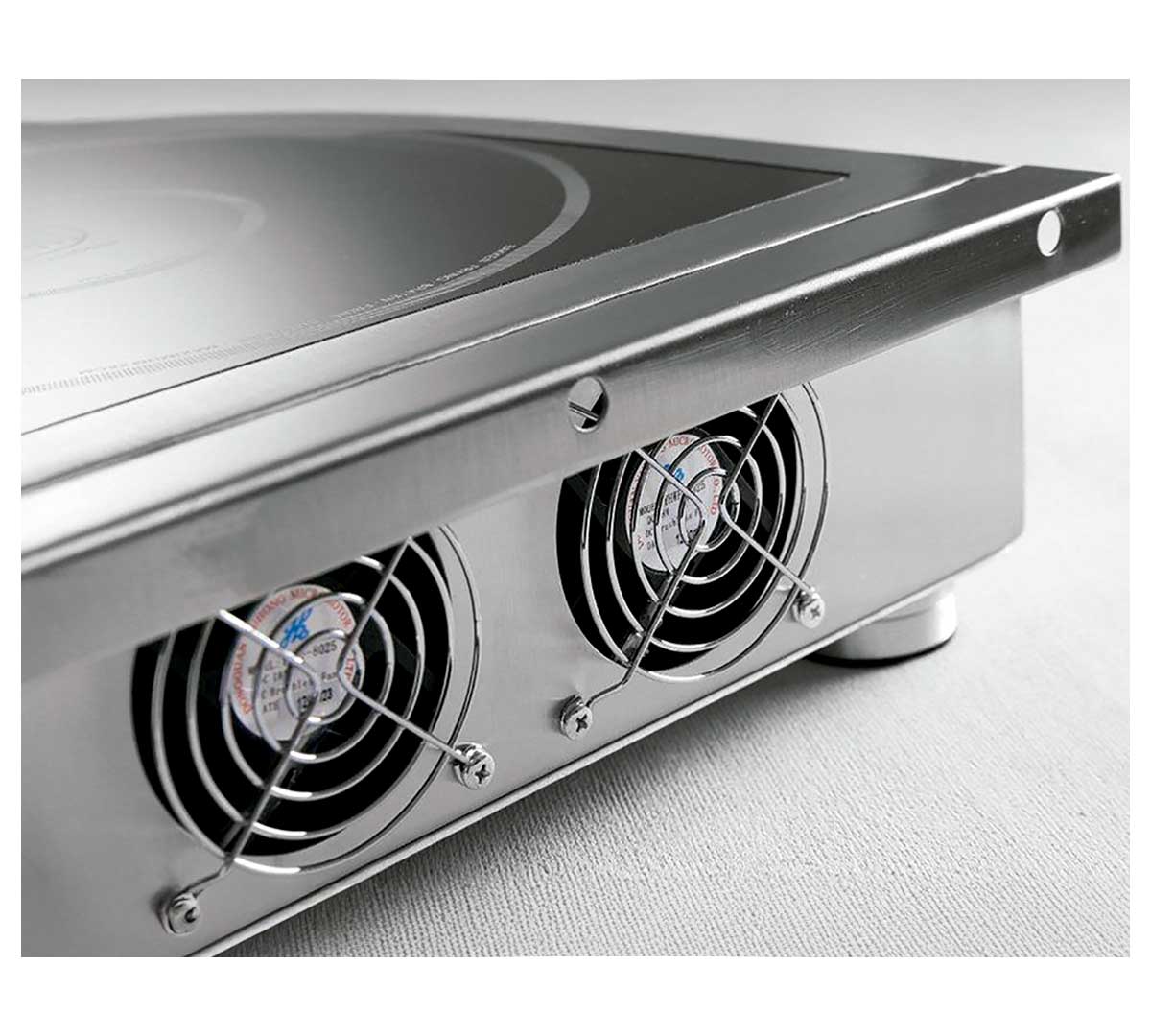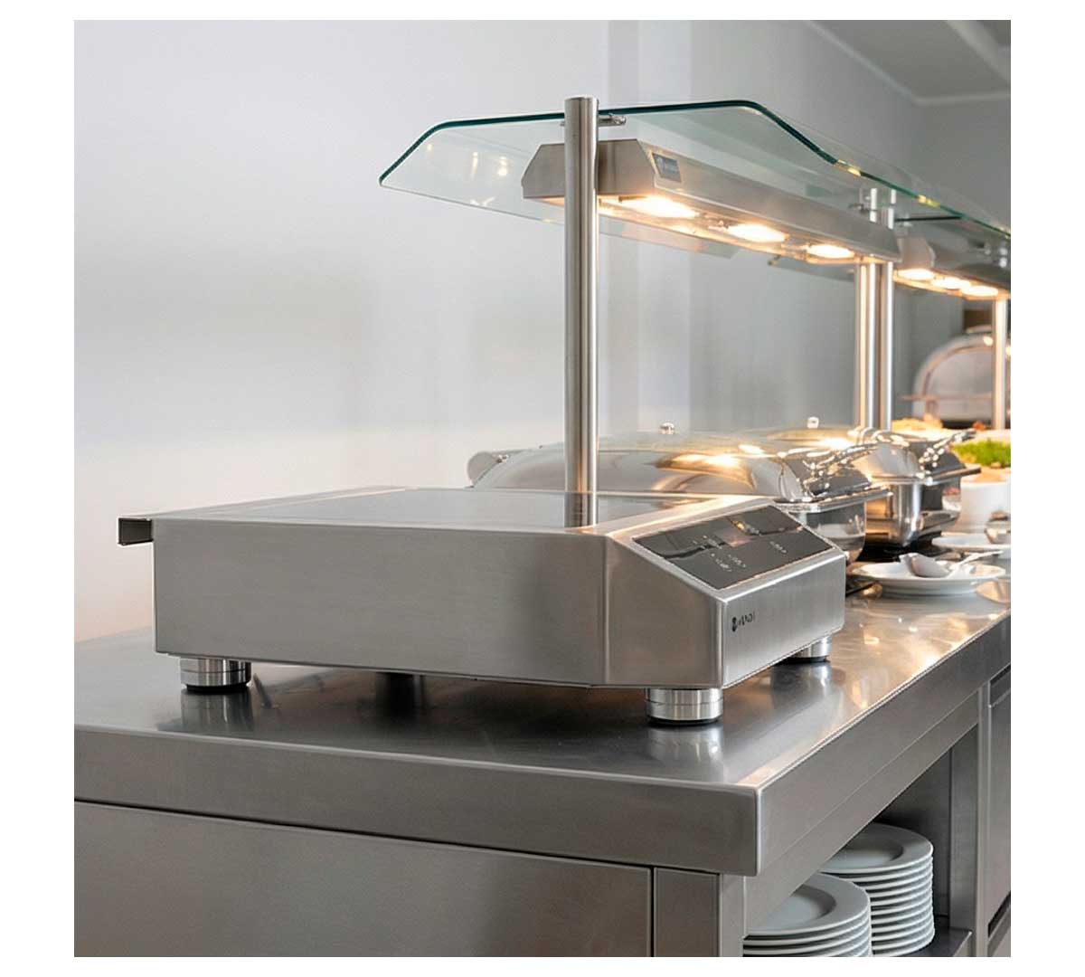 Placa de inducción con configuración digital de potencia, temperatura y tiempo mediante controles táctiles. Apta para recipientes con un fondo de entre 14 y 28 cm. La estructura es de acero inoxidable. Con ventilación doble y pies de altura ajustables.