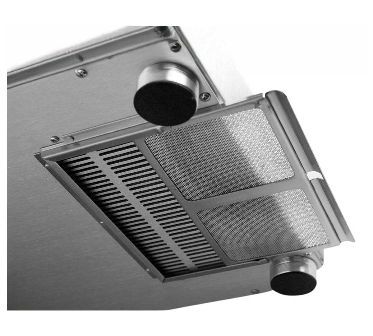 Incorpora un filtro de grasa fácil de limpiar y una doble ventilación para evitar la acumulación de grasa y humedad, lo que protege la placa y alarga su vida útil en ambientes profesionales.