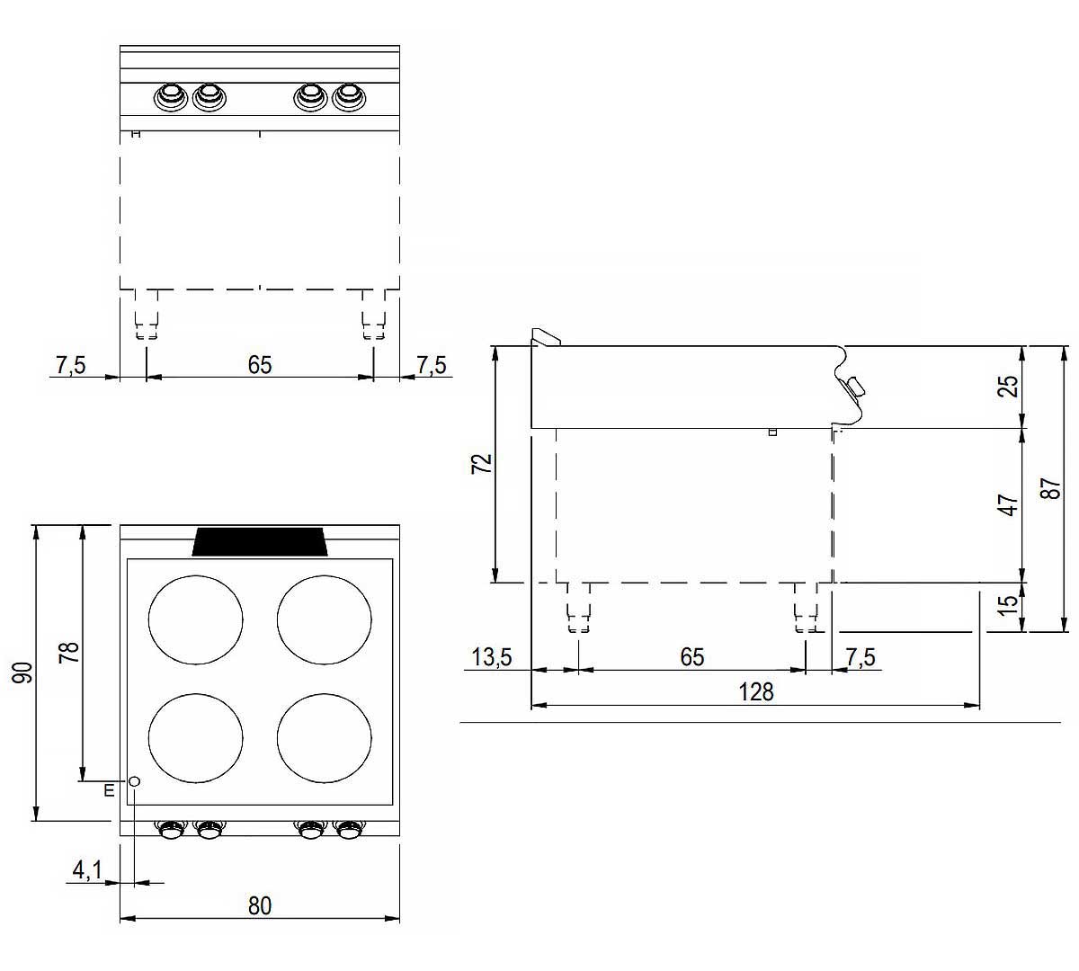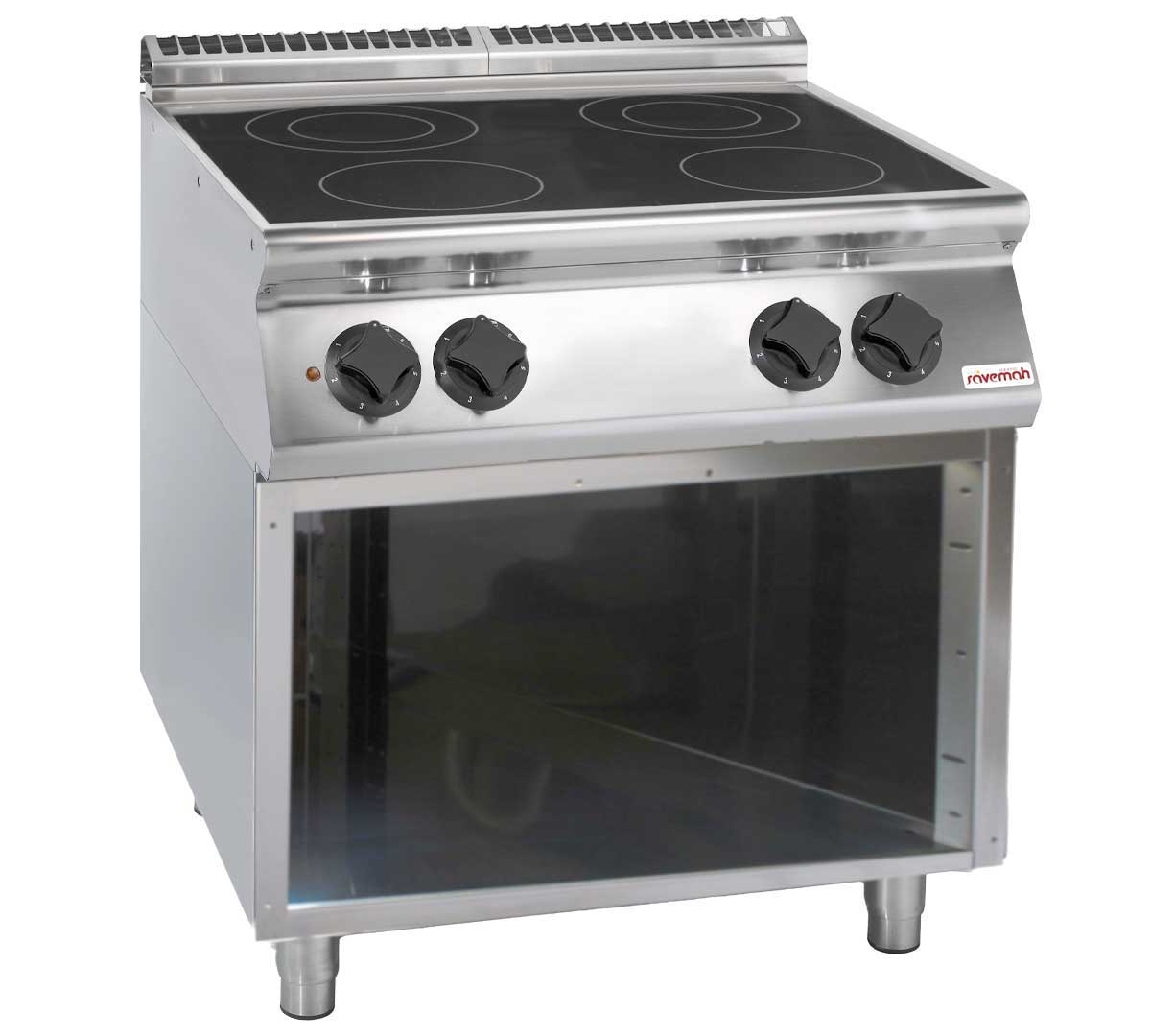 Cocina de inducción con 4 zonas independientes. Encimera fabricada en acero inoxidable y superficie vitrocerámica sellada. Regulación precisa de potencia y sistema de detección de recipientes.