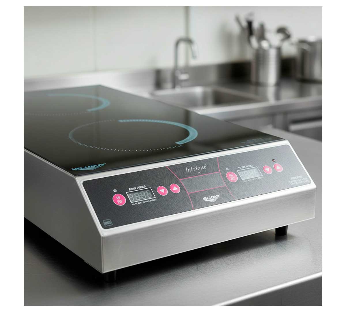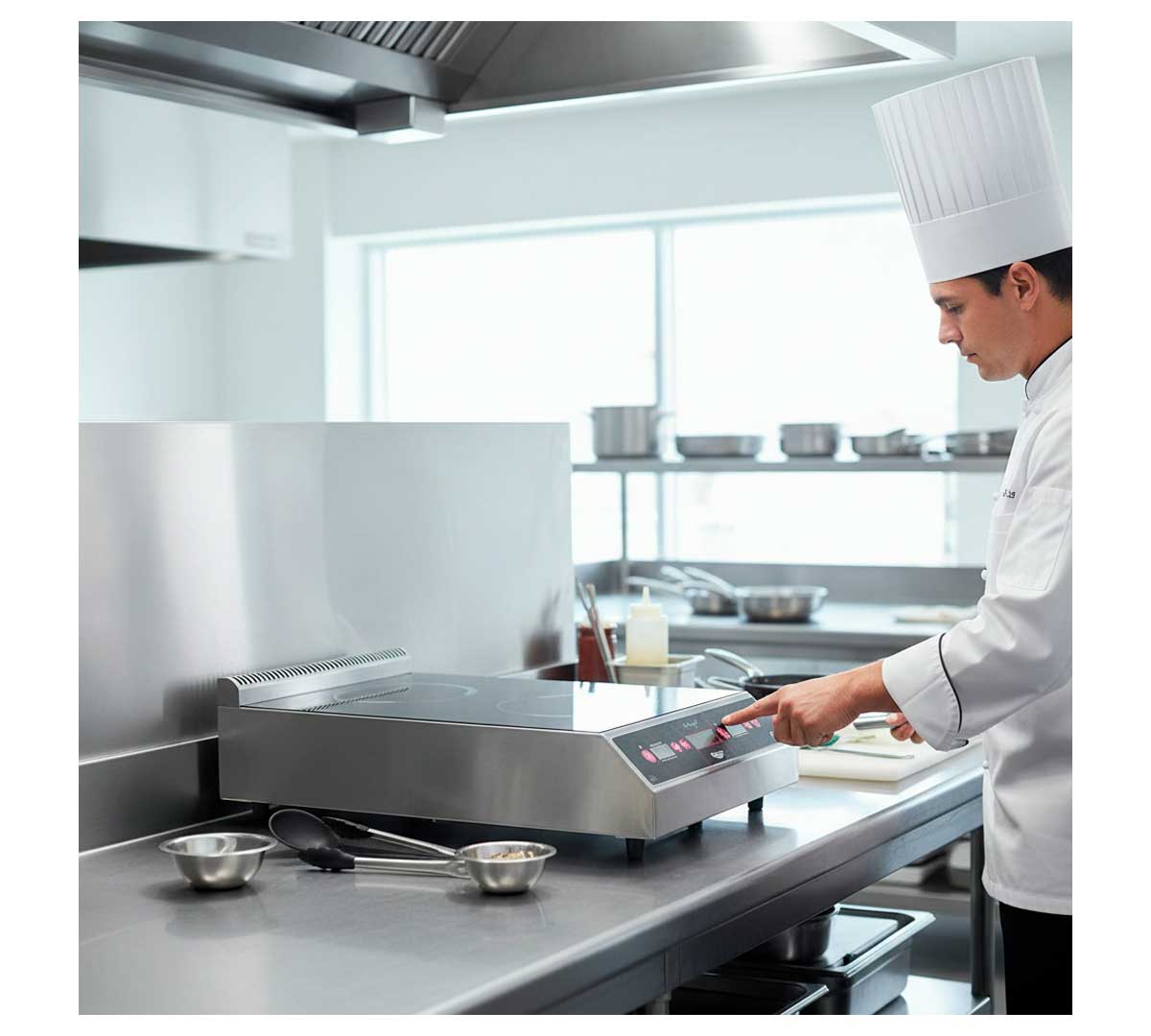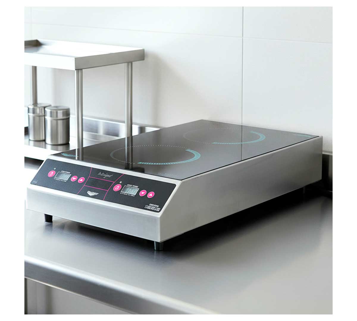 Placa de inducción de uso profesional con quemador doble adelante y atrás. Indicada para la preparación de salsas, cremas, así como para cocción a altas temperaturas. Con pantalla que muestra el nivel de potencia o el tiempo e indicador LED de temperatura. Ideal para buffet.