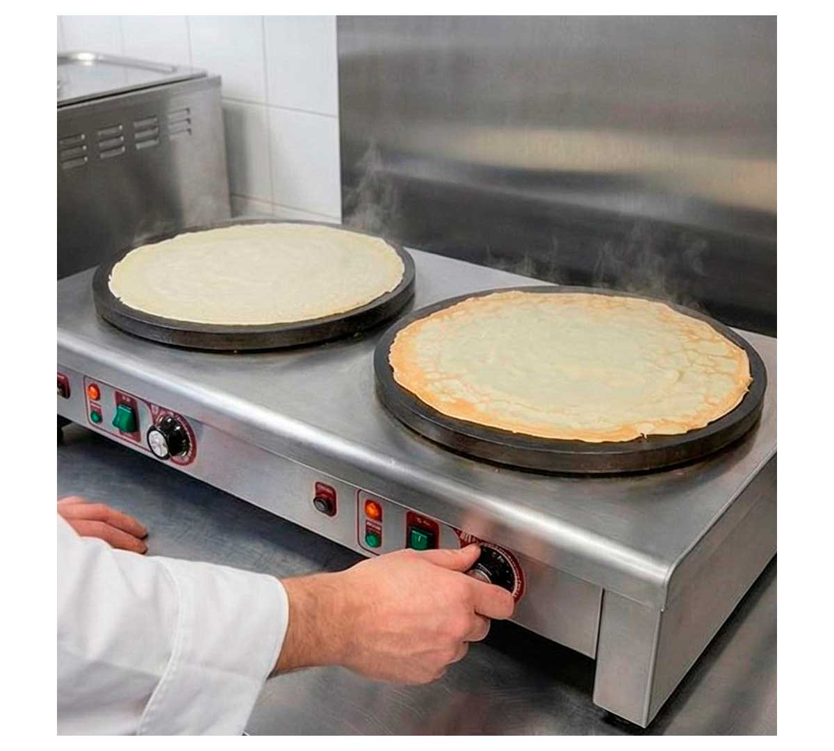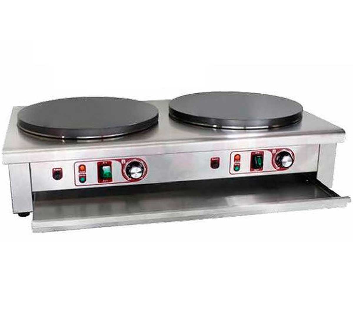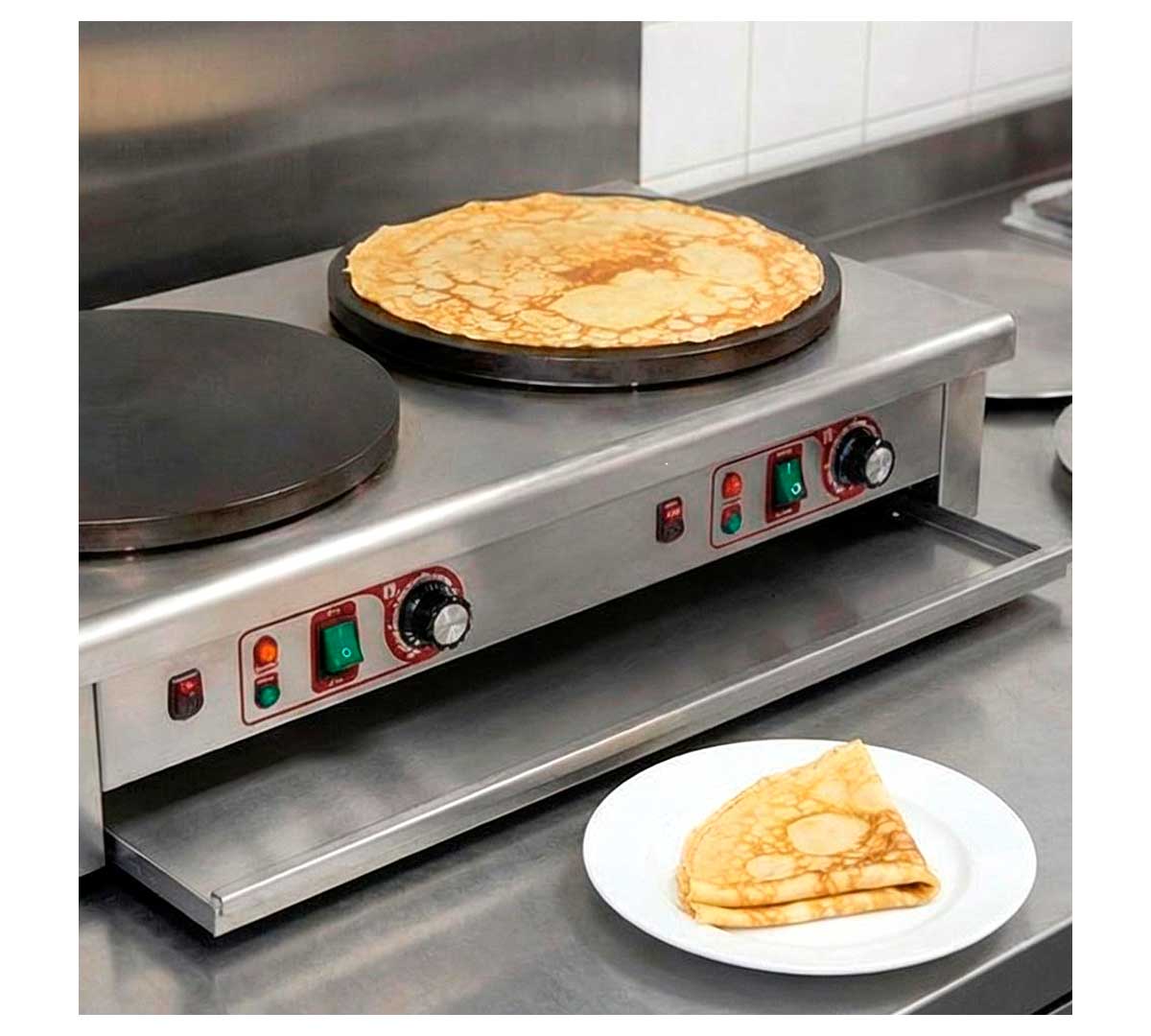 Crepera doble con dos placas de calor. Cada placa se controla independientemente. Tiene termostato para regular y controlar la estabilidad de la temperatura. Incluye bandeja inferior para recoger la grasa. Recomendada para uso poco intensivo. Incluye espátula para distribuir la masa.