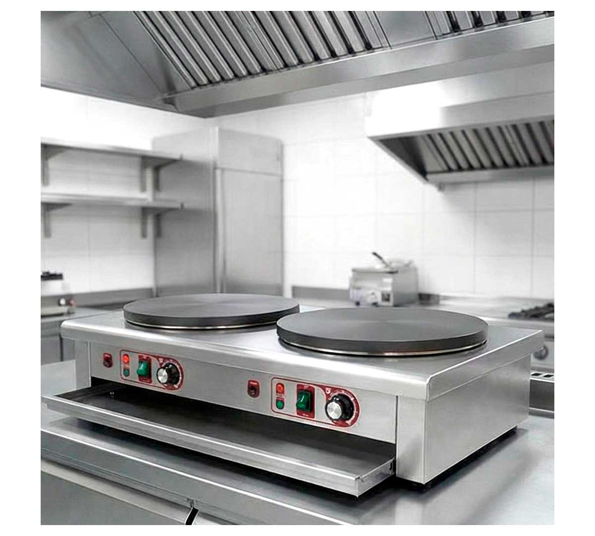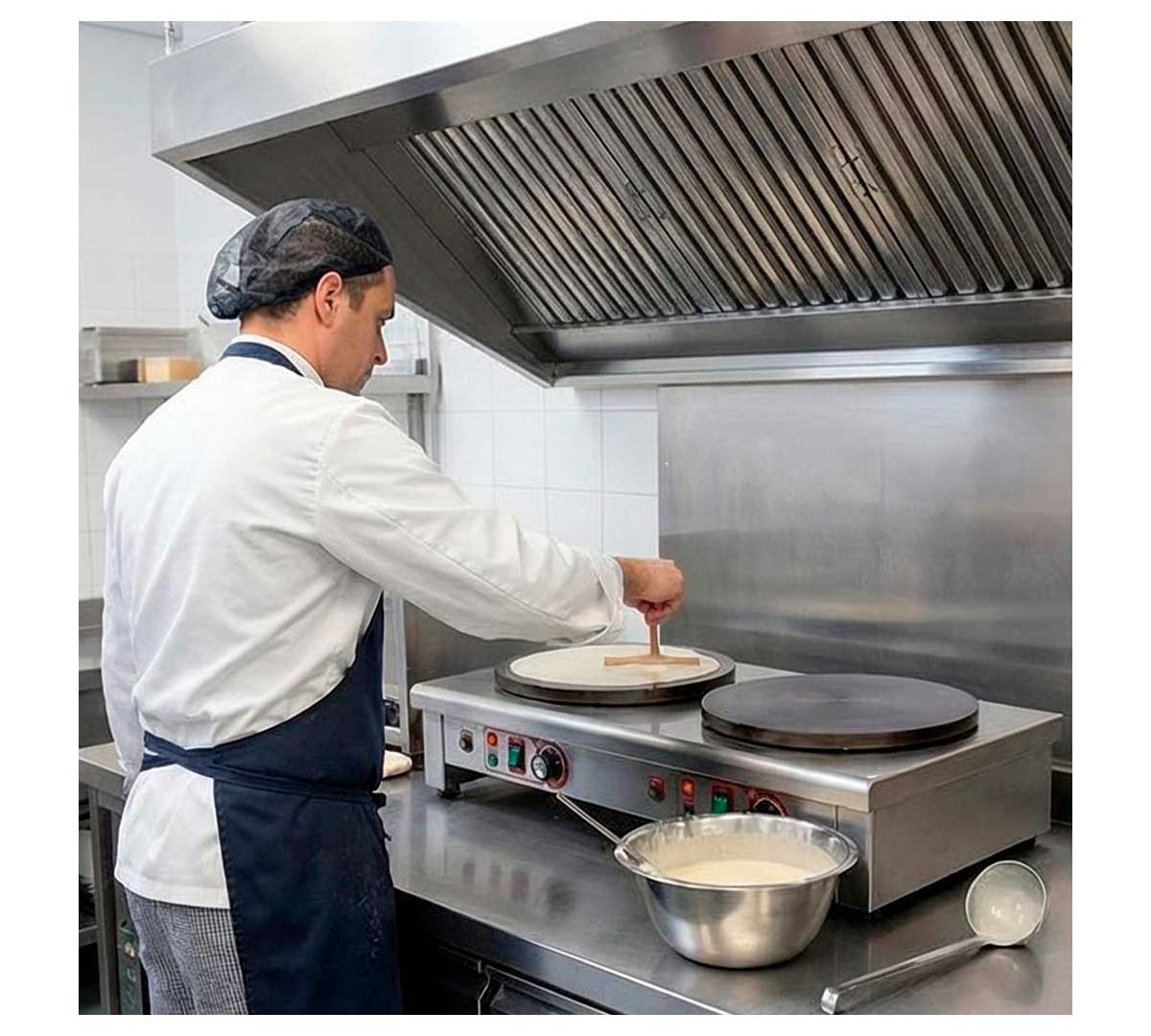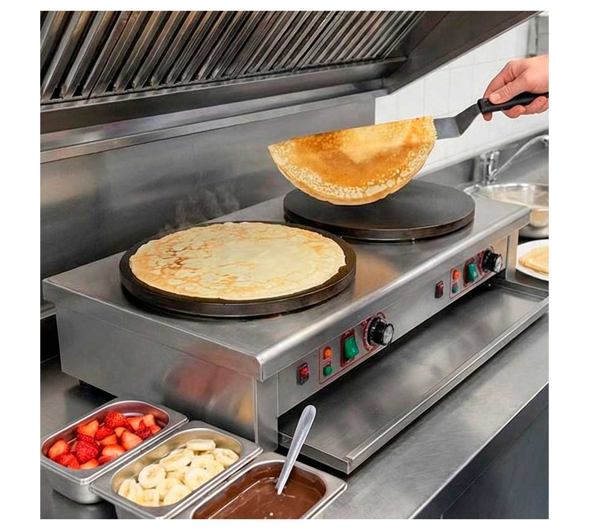 Crepera doble con dos placas de calor. Cada placa se controla independientemente. Tiene termostato para regular y controlar la estabilidad de la temperatura. Incluye bandeja inferior para recoger la grasa. Recomendada para uso poco intensivo. Incluye espátula para distribuir la masa.