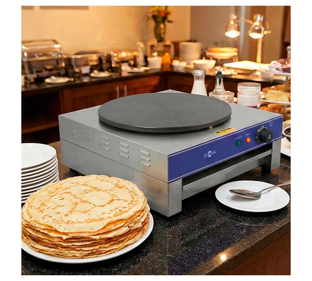 Crepera eléctrica con una placa de calor. Está equipada con un termostato graduable y de seguridad. Incluye bandeja para recoger la grasa y espátula. Recomendada para uso poco intensivo.