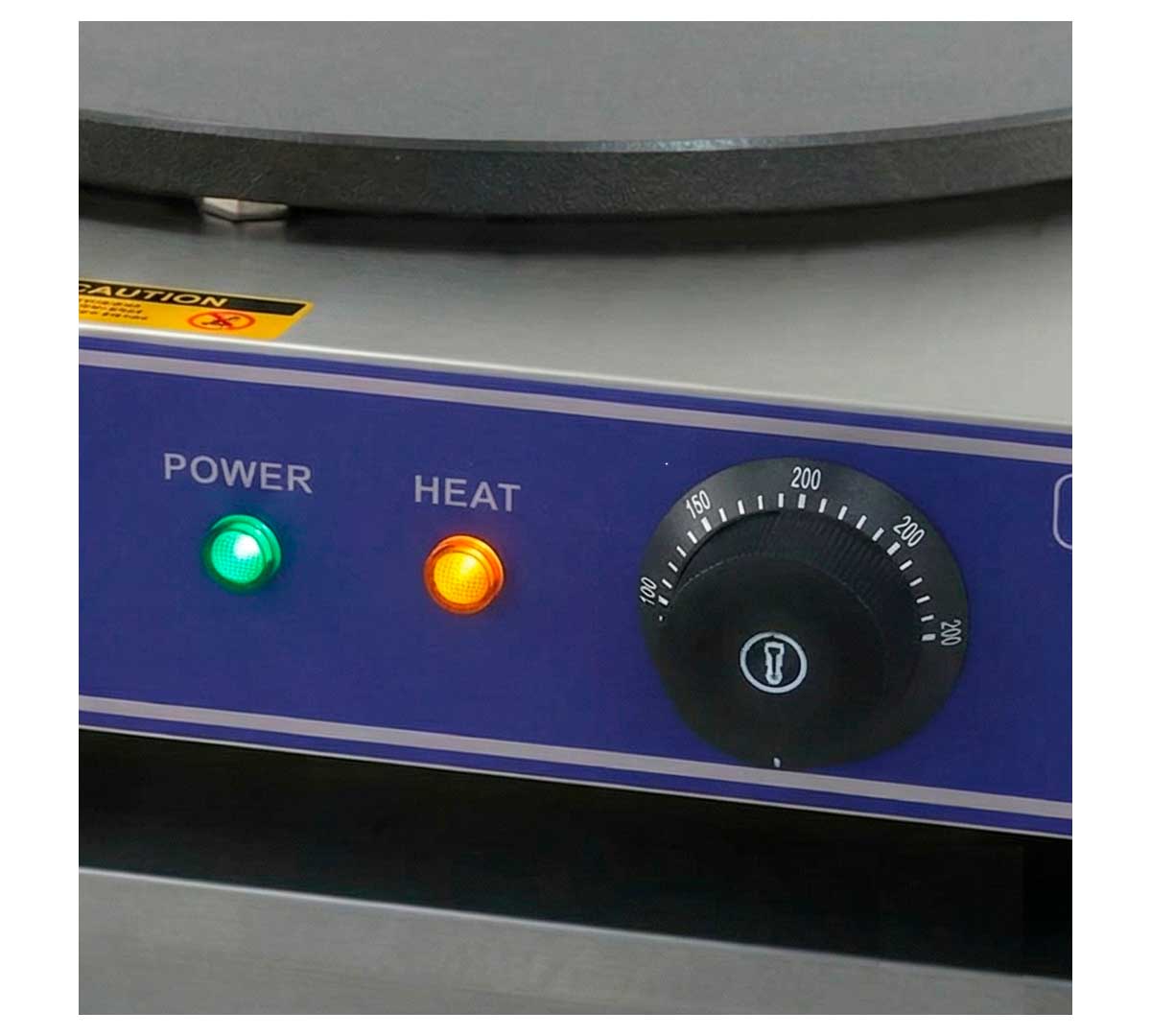 La Crepera Simple CRE-S de Irimar está fabricada en acero inoxidable. Este modelo está equipado con un termostato graduable de 50 a 300 ºC. Además, dispone de un sistema de seguridad de temperatura y de un indicador de encendido y calentamiento.