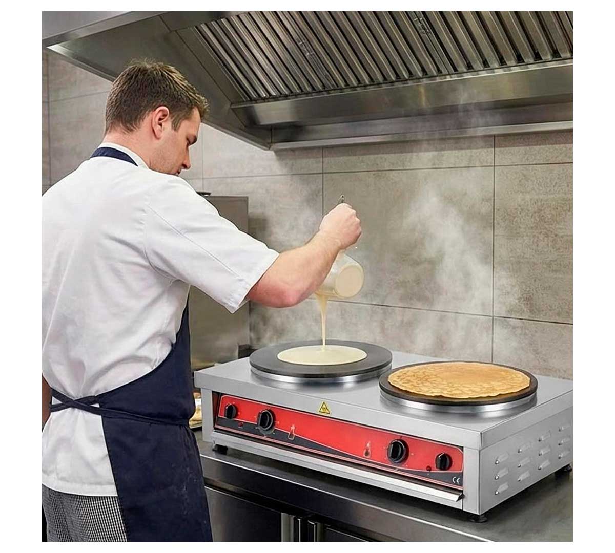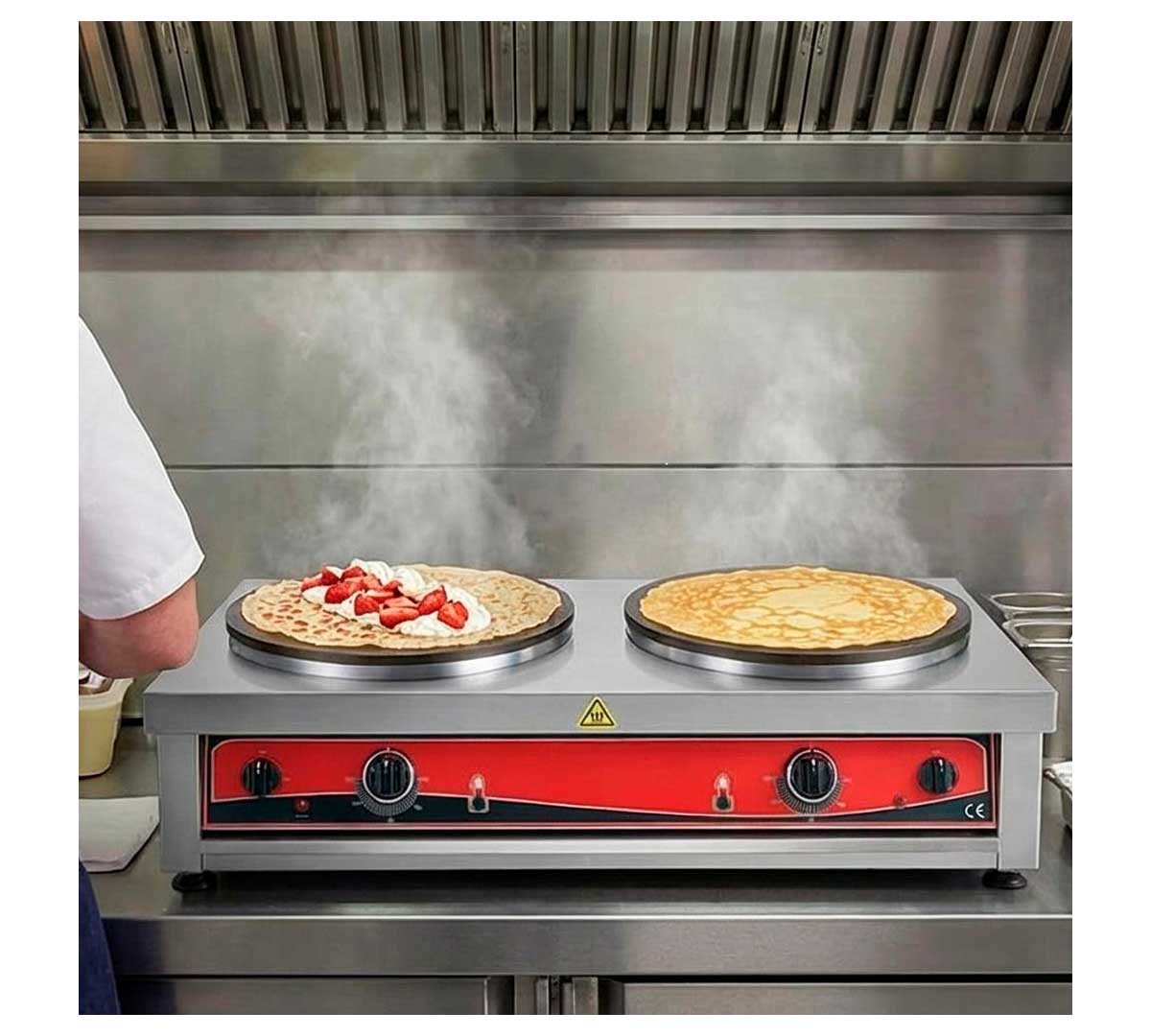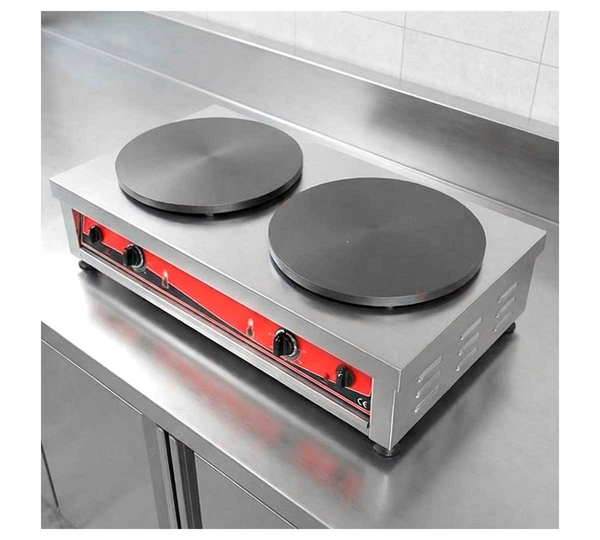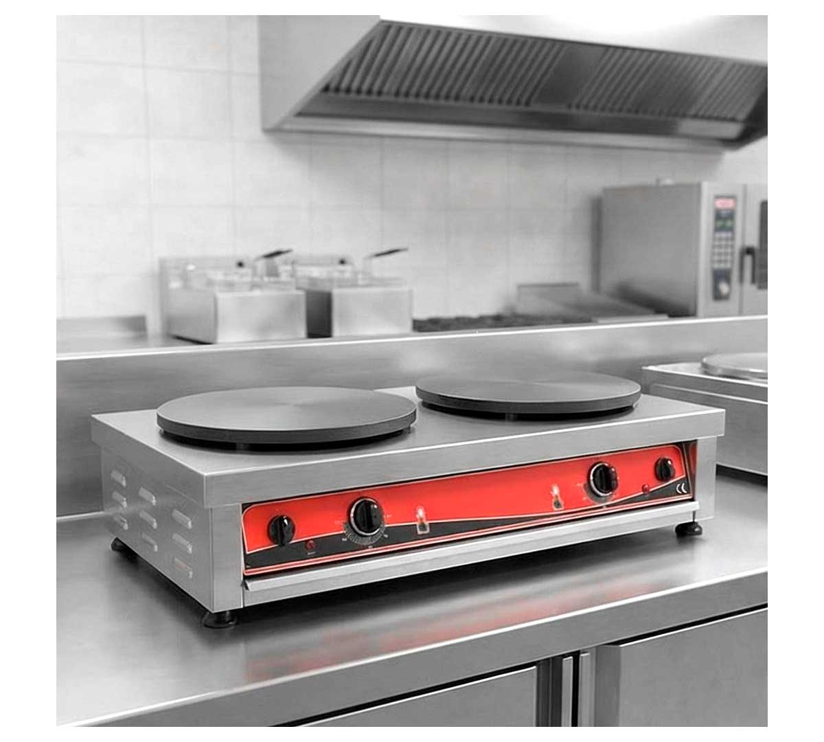 Este equipo de cocina especializado está diseñado específicamente para la preparación de crepes o panqueques finos de origen francés. Tiene una superficie plana circular que permite extender la masa de crepe de forma uniforme.