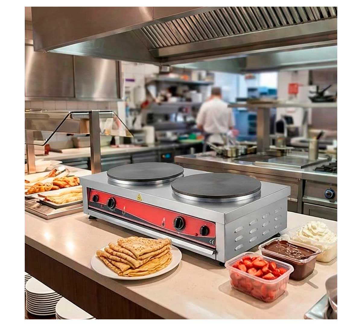 Crepera eléctrica con dos placas calentadoras. La estructura es de acero inoxidable. Permite regular la temperatura de 50 a 300 ºC. Con interruptor de apagado y encendido.