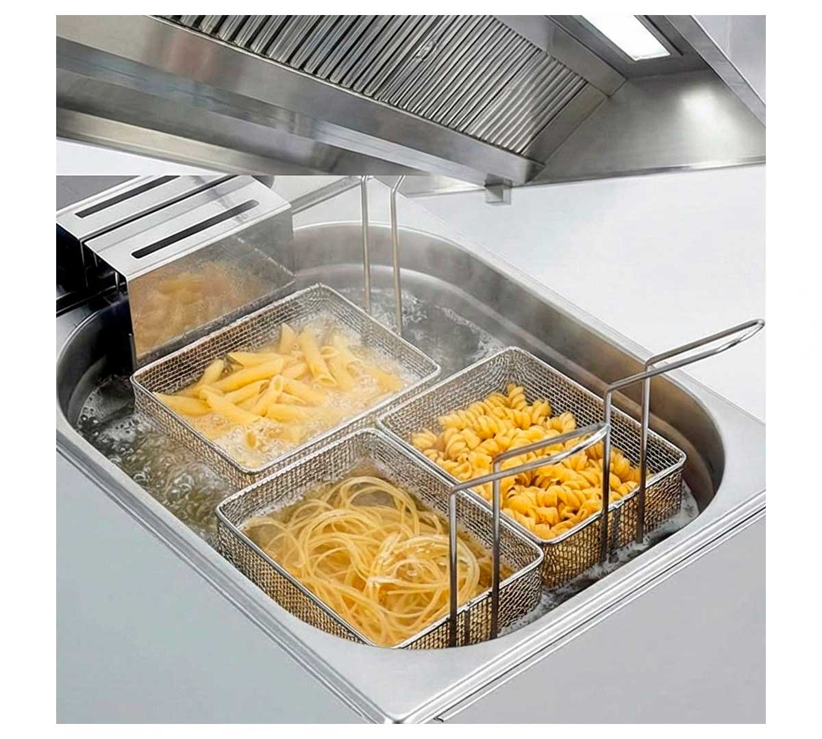Cuece pastas de sobremesa fabricado en acero inoxidable. Tiene un ancho de 27 cm y capacidad para 3 cestas (incluidas).