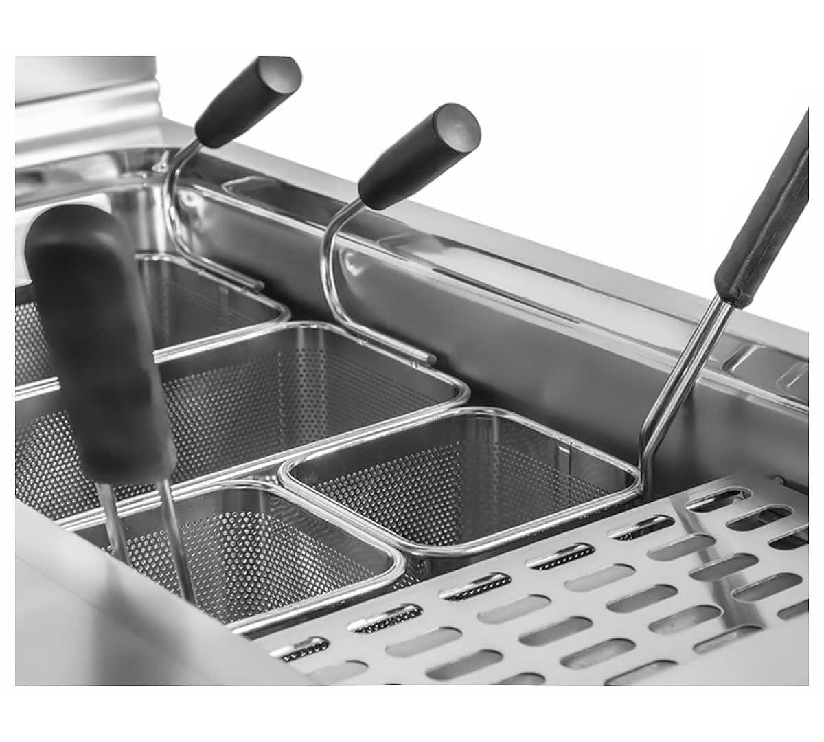 Esta cesta doble para cocedor de pasta es perfecta para restaurantes, cocinas colectivas, caterings y cualquier entorno donde se requiera preparar pasta de forma rápida y eficiente. Permite separar tipos de pasta o controlar diferentes tiempos de cocción en un mismo servicio, optimizando el rendimiento del equipo principal.