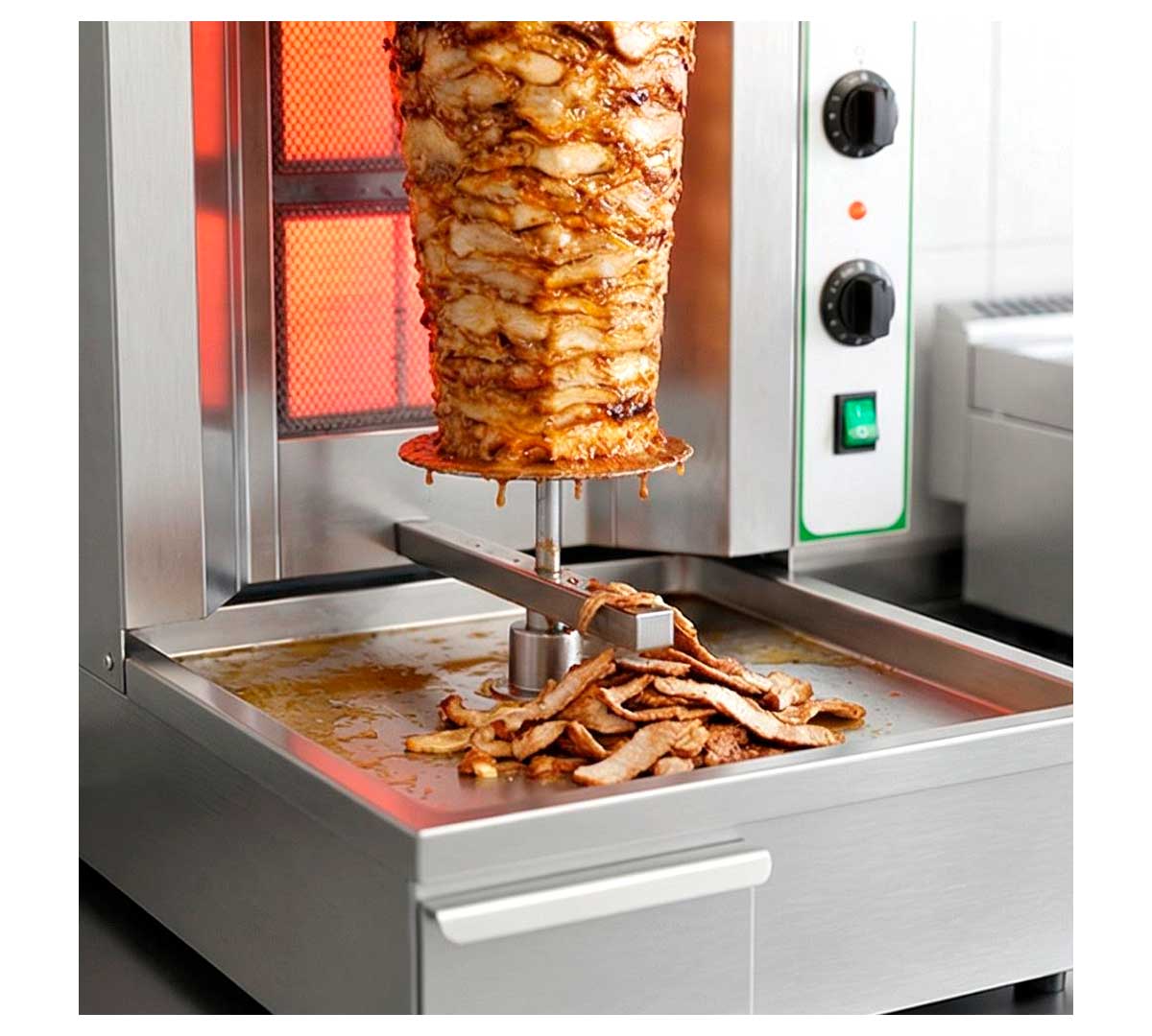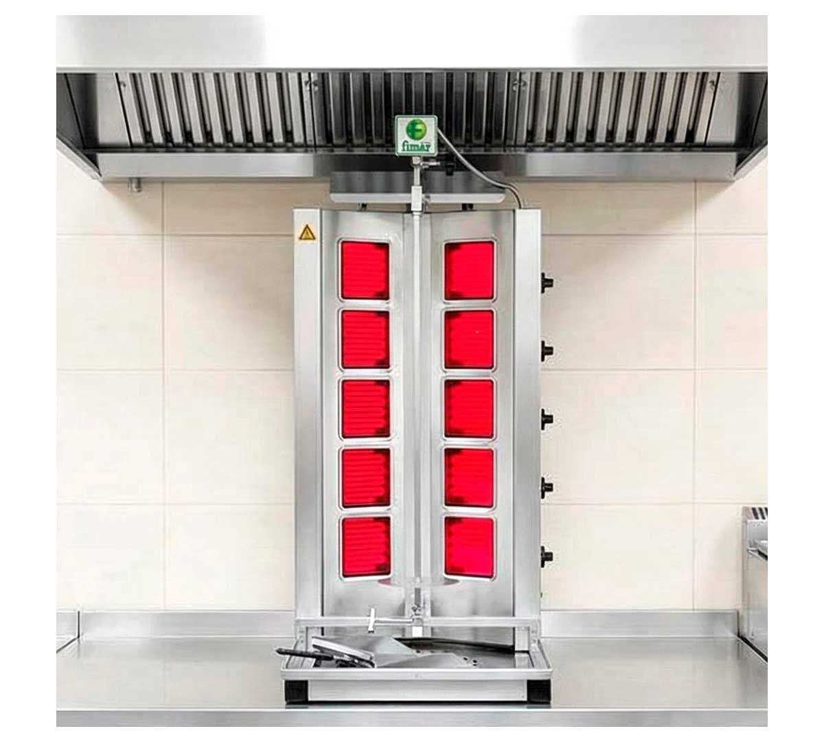 Máquina para cocinar carne para kebab, en seco o con aceite. Con estructura de acero inoxidable. Equipado con cajón de residuos de cocción y sistema de encendido por piezoeléctricos. Apto para piezas de carne de un diámetro máximo de 47 cm.