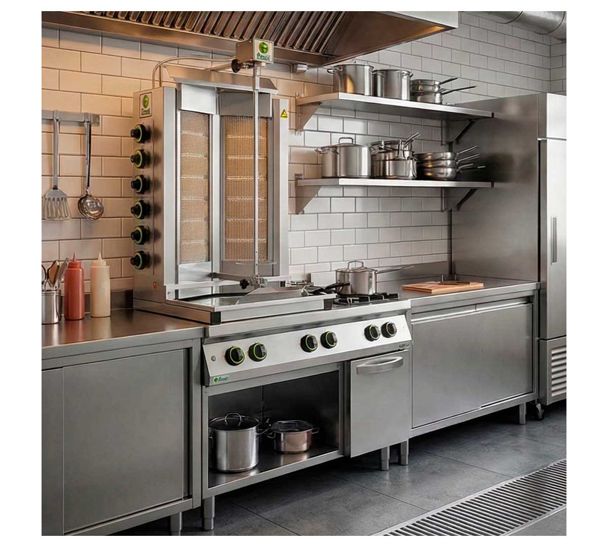Asador gyro preparado para gas natural. Especial para kebab, con estructura de acero inoxidable. Equipado con cajón de residuos de cocción y sistema de encendido por piezoeléctricos. Incluye cajón para la recogida de los residuos de la cocción. Este modelo es a gas butano o propano y también incluye inyectores para gas natural.