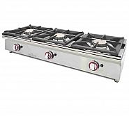 Cocina a gas de acero inoxidable de tres fuegos. Su diseño compacto de sobremesa es práctico y funcional. Provista de fogón con termopar de gran poder calorífico y toma de gas en la parte trasera. Equipada con rejillas desmontables de hierro.