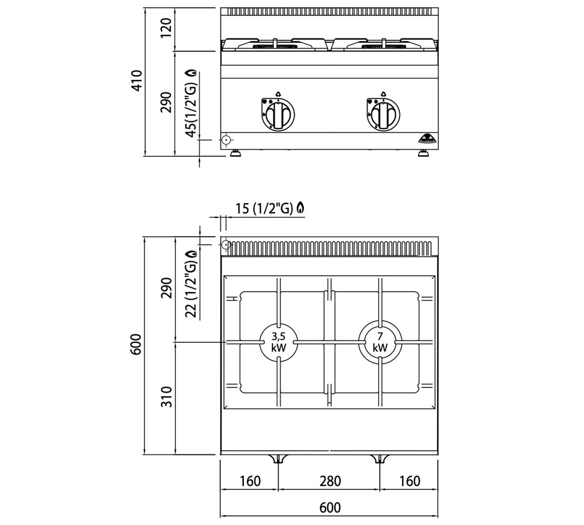 Cocina a gas de 2 fuegos de alta potencia. Estructura en acero inoxidable. Quemadores de hierro fundido, rejillas robustas y cubeta extraíble para facilitar la limpieza y el mantenimiento.