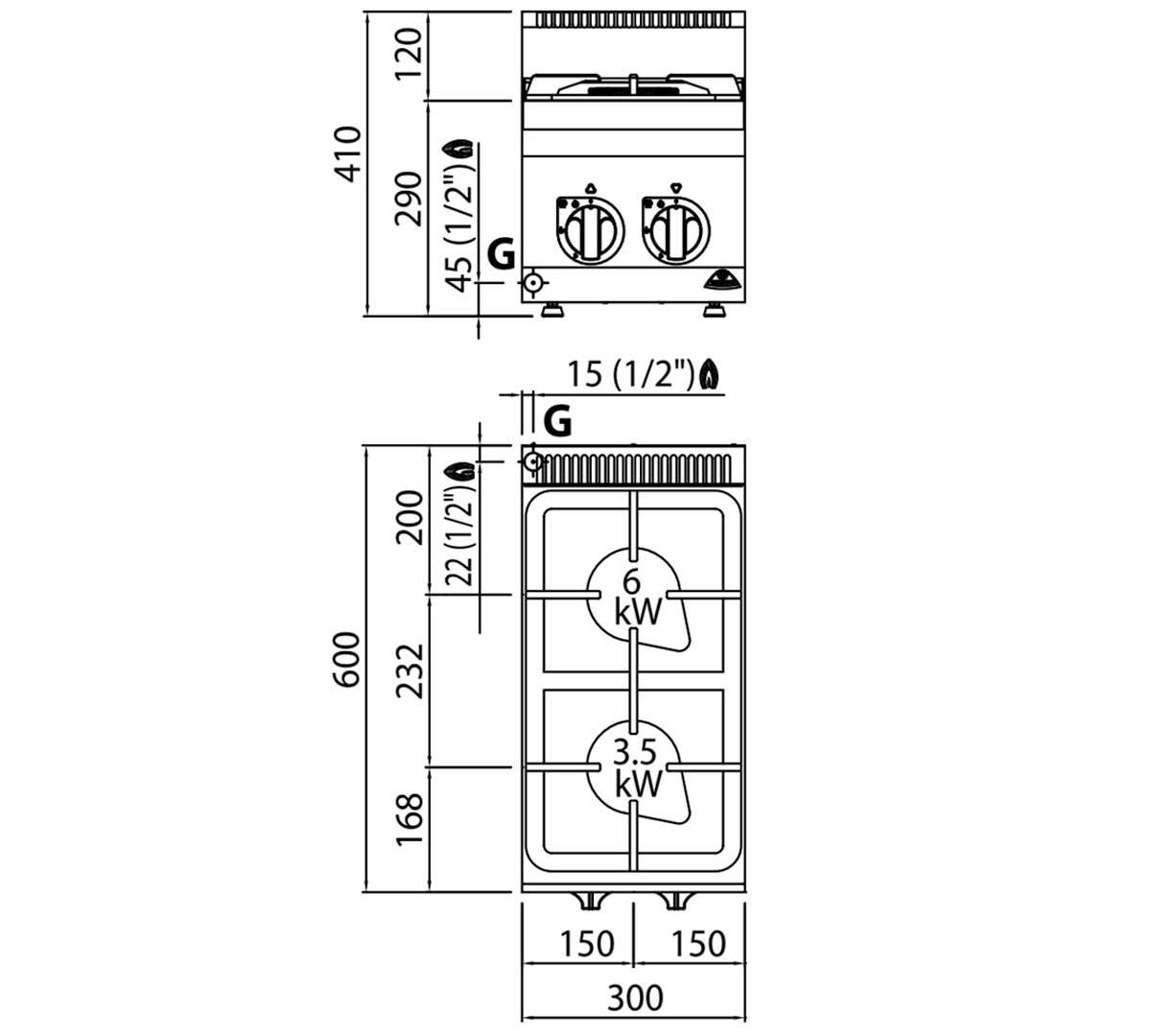 Cocina de sobremesa de diseño modular. Forma parte de la serie 600 a gas. Equipada con dos quemadores de hierro fundido y una potencia de 9,5 kW. Incorpora llama piloto y termopar de seguridad.