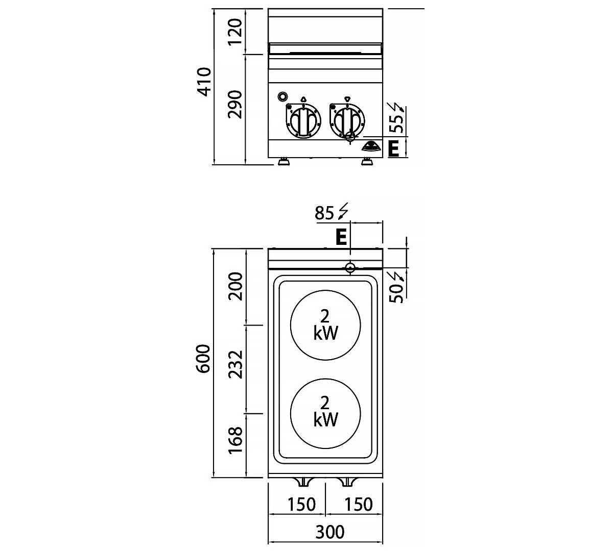 La Cocina E6P2B pertenece a la Serie Plus 600, con 2 placas eléctricas de 2 kW cada una y estructura compacta para uso intensivo.