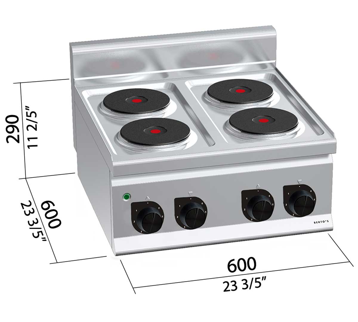 La Cocina Serie Plus 600 Eléctrica 4 Placas Bertos es una solución robusta y eficiente para quienes buscan una cocina eléctrica de sobremesa con altas prestaciones y fiabilidad.
